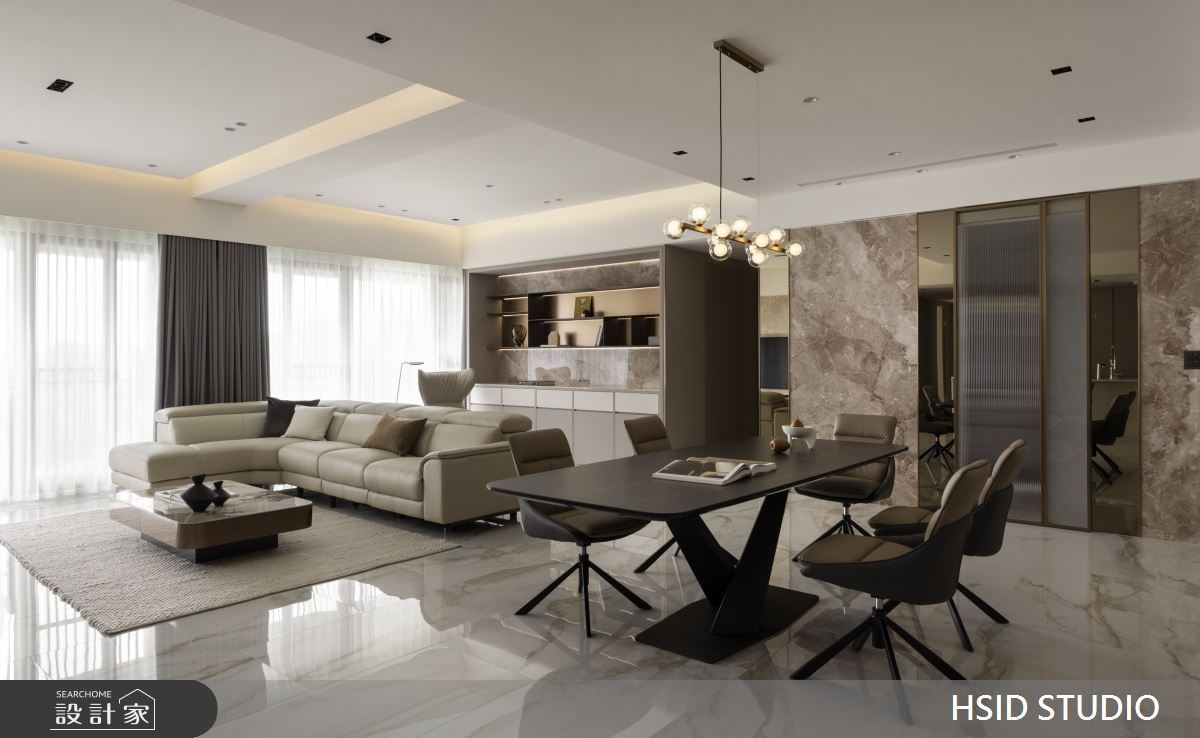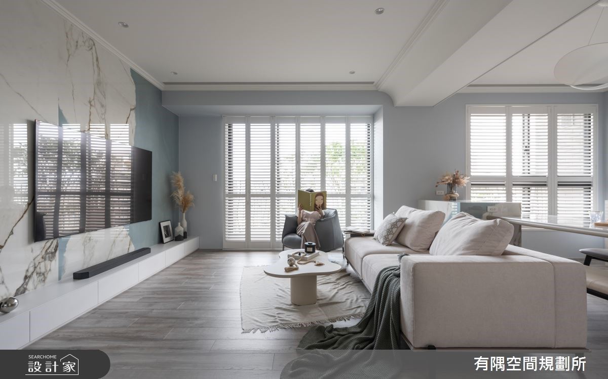 為了構築居住氛圍,「燈光」是家居設計中不可忽略的重要因素。踏入26坪混搭宅,迎面而來的金屬造型屏隔,排除了穿堂煞的風水疑慮,更成為開放式空間中的亮點,設計師運用大面積的大理石牆,展現低調奢華的大器感,牆面連貫至玄關入口處與收納櫃體連接,讓空間看起來更開闊;客廳擺放土耳其藍的單人沙發椅,使整體色彩更加跳脫且明亮,餐廳則加入溫煦木質感,讓整體空間保有溫度。