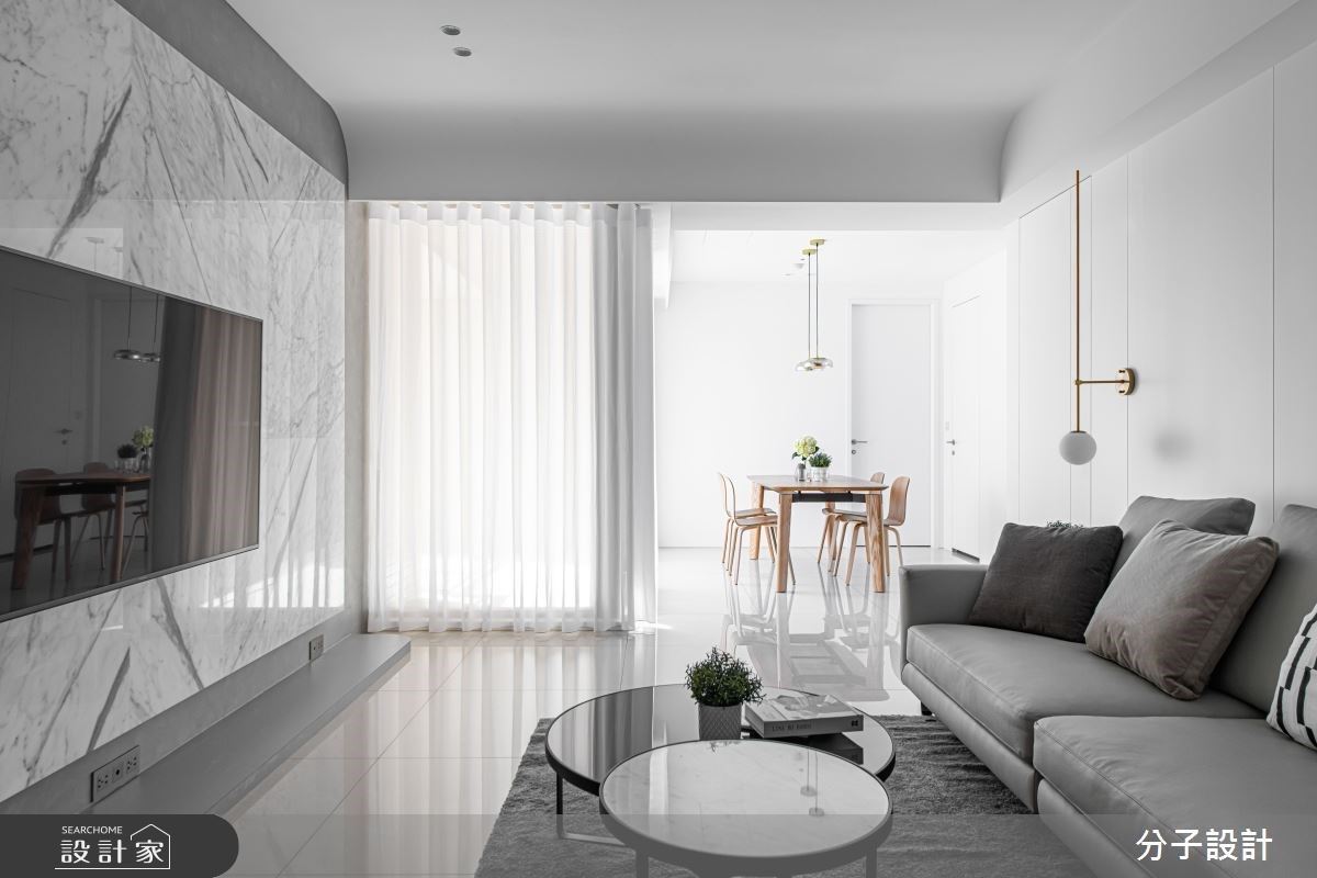 公領域承襲著大片的落地窗面,納入美好採光與日夜景觀,造就敞朗的視覺體驗,並使用最簡單原始的設計語彙,使用單一顏色演繹極簡層次,結合不同材質運用,將現代風格與低飽和度色彩相做出完美結合,且善用通透玻璃作綴點,讓整體不致於過度沉重,妝點出淨透的視覺亮點;私領域部分,因原有格局為雙主臥,設計師加以改造,變成三房更符合使用,並揉入單一灰階,使空間更為簡潔,營造出極簡品味!