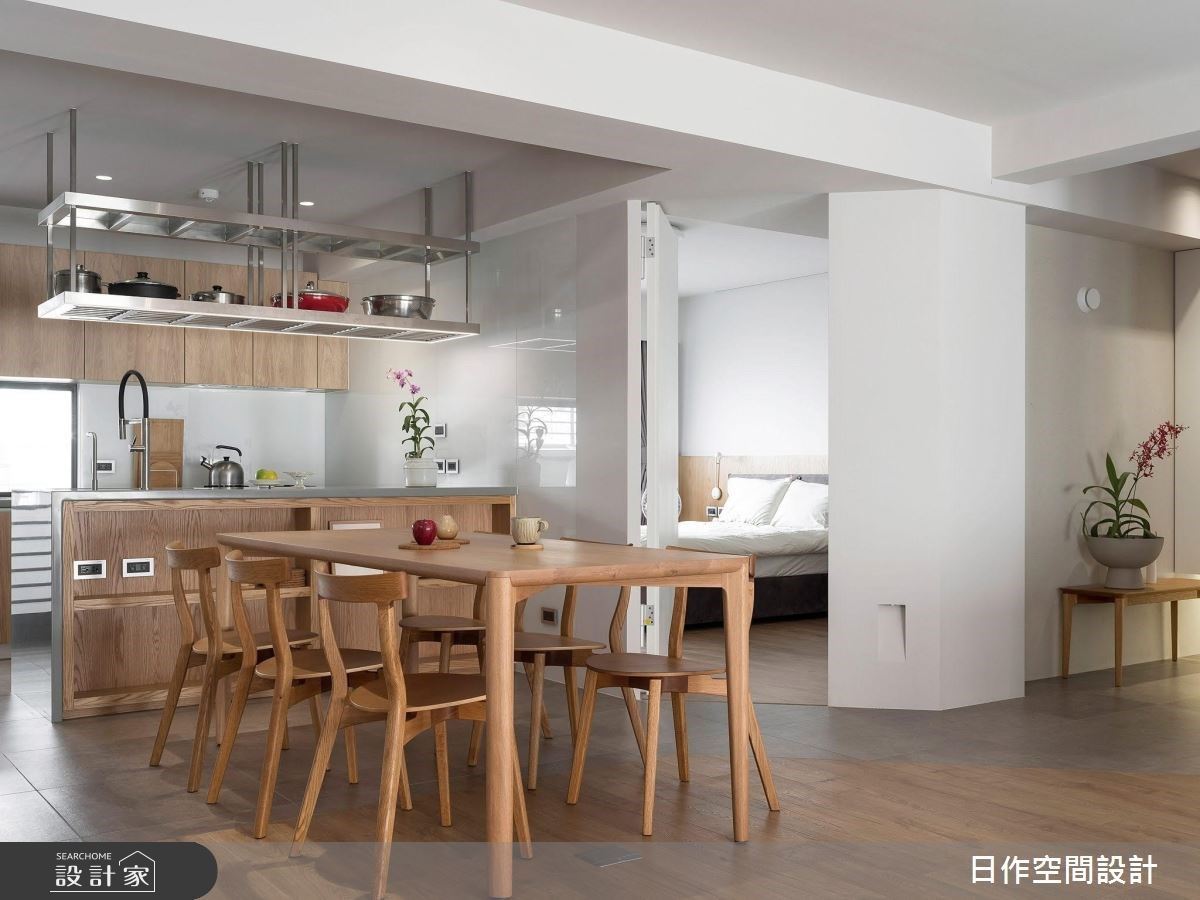 格局擘劃上,一氣呵成串起客廳、書房與餐廚區域,在有限的坪數中,建立超越想像的開闊視野,而外窗流瀉而下日光,則為室內帶來一絲徐徐暖意。客廳區域,以減法設計捨去不必要的裝飾,僅留下輕巧且實用的家具,填入清新的木白配色,詮釋出零負擔的居家場景。餐廚區域,以一塵不染的純白廚房,巧搭樑柱旁的木質吧台餐桌,給予彈性而便利的備餐空間,更詮釋出如同日劇的用餐場景。