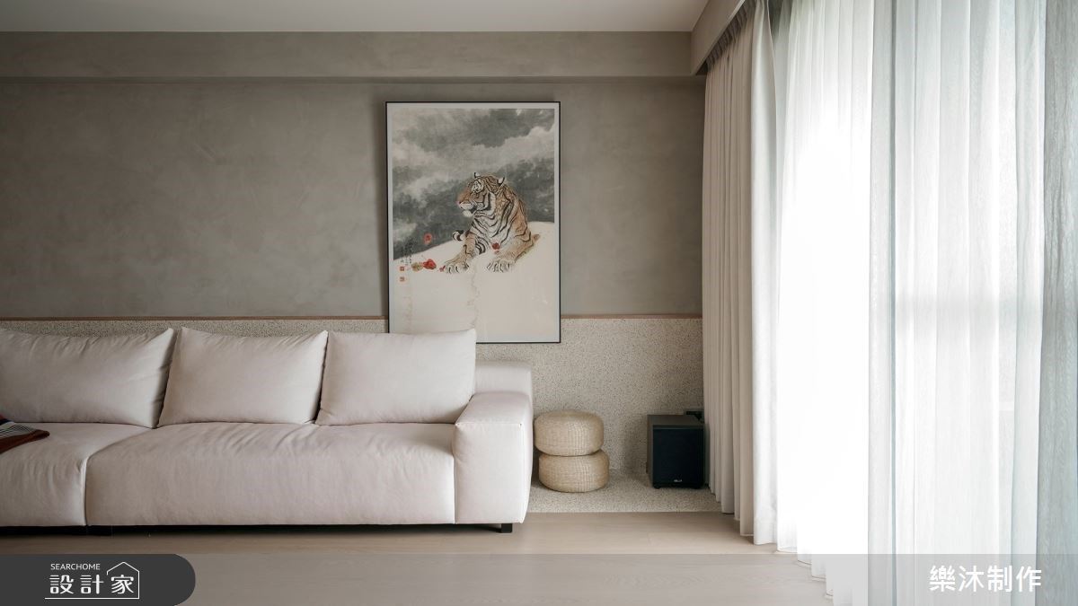 入門玄關處的大面收納展示櫃,以部分懸空的手法營造空間輕盈與層次感,設計師為打造開放式的空間,捨棄原建商規劃的小臥室空間,將其規劃為公領域的一部分,讓敞開的客、餐、書房區域也能走入小坪數空間;客廳區域以深灰暈染造型地毯鋪陳場域,搭配俐落外型的灰色沙發,為暖調空間挹注理性性格;後方書桌區以半高弧形牆面作為書桌與客廳的明確分野,於窗邊加入臥榻機能,不僅滿足屋主對居住空間的期待成為工作期間小憩的角落,更為公領域增添一抹慵懶氣息;餐廳區域以深淺木色拼接造型的餐桌,與跳色牆面界定用餐空間,同時阻擋廚房的料理油煙,後方牆面的高彩度展示畫,化身木質調空間的目光聚焦處,設計師於空間內運用大量的木質軟裝,讓簡練清新的特性無形中走入屋主的生活場域。