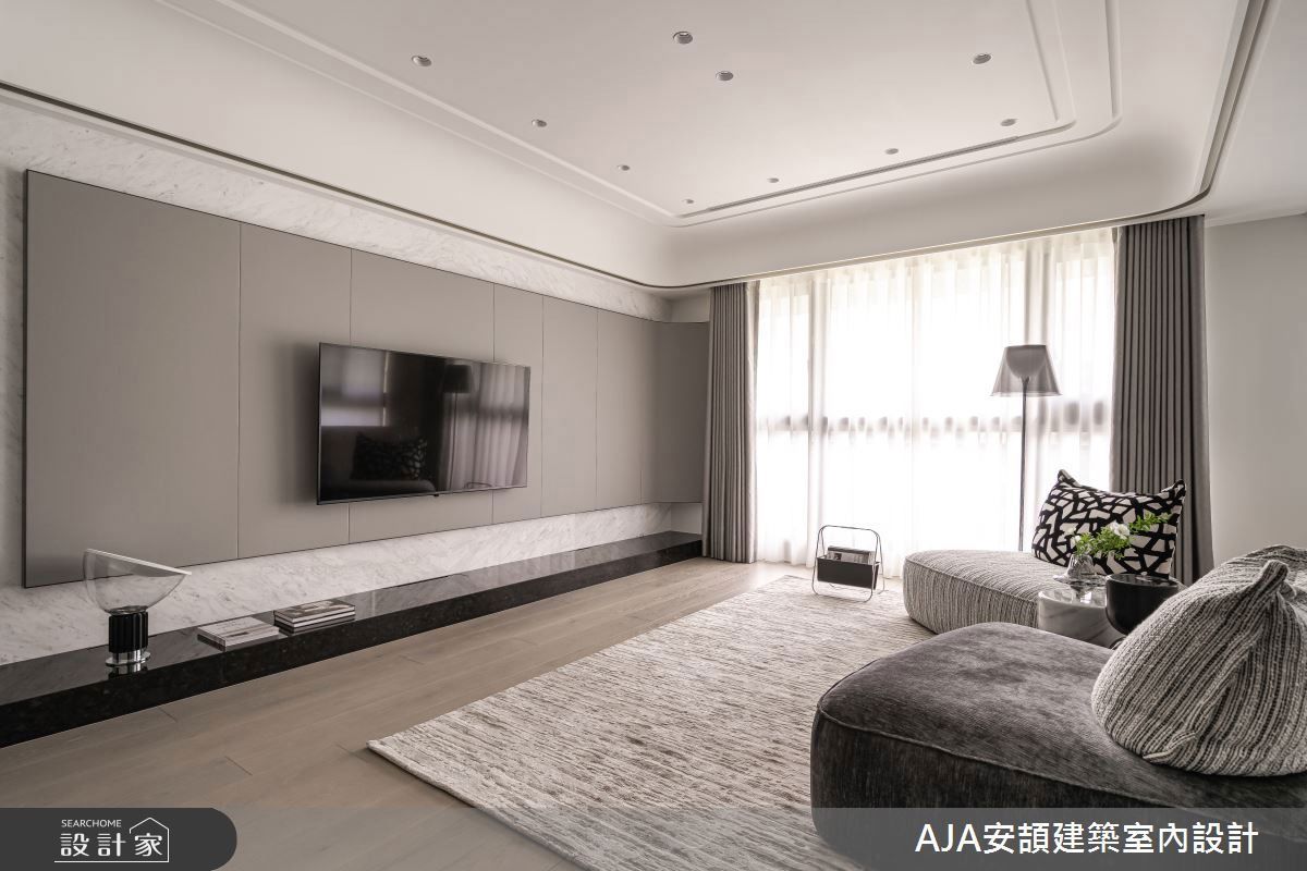 這間 70 坪的現代風宅邸,璧川設計以密斯凡德羅的巴塞隆納展覽館為繆思,於簡單的空間造型搭配富有表情的建材,也同時串連起不同世代對空間的歸屬感。主臥空間座落於書房之中,將門扇關起即是個人小宇宙:這裡擺放屋主收藏的 B&O 音響及復古家具,搭配一張設計師躺椅,在繁忙的公事之後,於此享受音樂饗宴並得到放鬆,書房連接主臥空間,並順著動線進入更衣室及主臥衛浴,狹長型的更衣空間,設計師利用通透的展示櫃化解壓迫感受,兩面設計也讓拿取更為便利。孝親房床頭上方橫過一根大樑,設計師藉由從天花至壁面以圓弧曲線化解剛硬的結構樑柱,跳脫空間直角帶來的壓迫感延伸出嶄新的空間尺度,弧形設計也讓空間內硬體的交疊更為和諧。