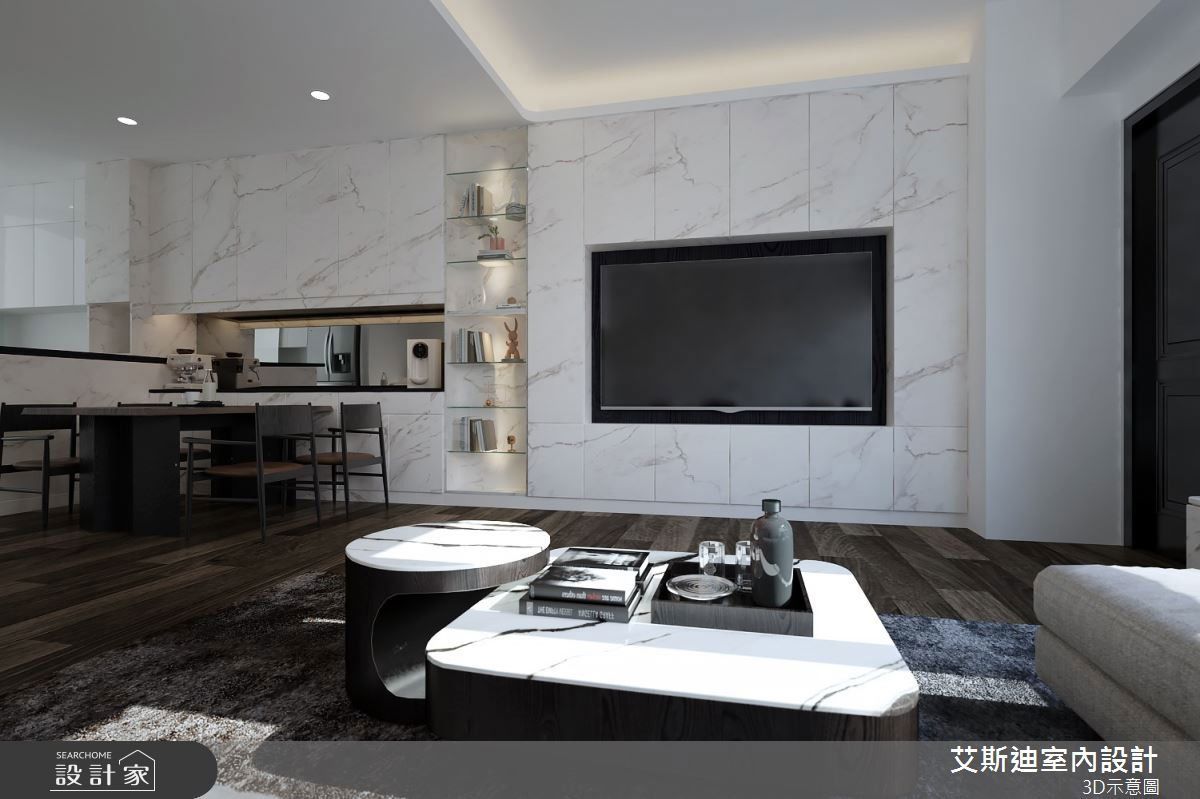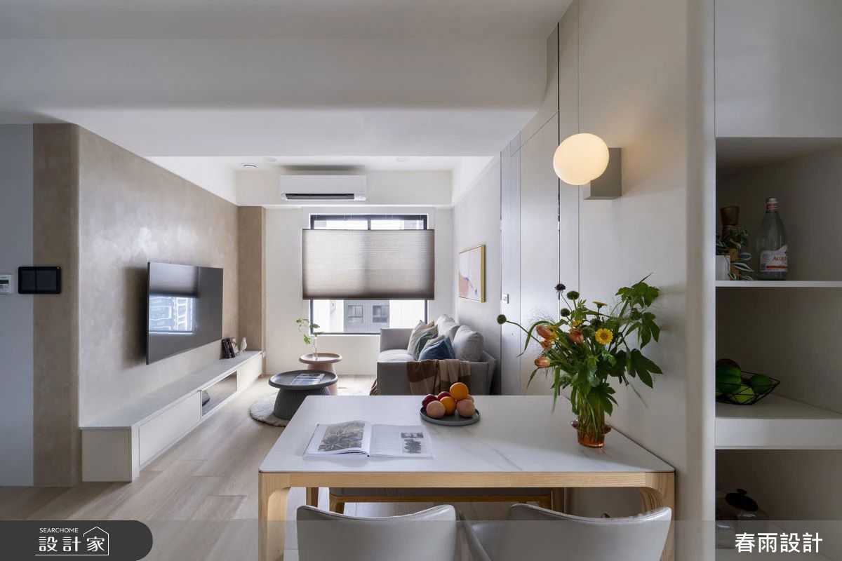 平常只有兩夫妻生活的世界,設計師在空間內採取開放式設計,公區以一石材長桌整合辦公、閱讀、用餐、吧檯功能,而同一軸線的主臥跳脫制式框架,利用輕透玻璃作隔間,讓視野更加通透寬敞,需要隱蔽性時,也能利用窗簾做屏蔽,保有個人隱私。臥房內,灰質柔軟的床頭上方設計了手動式的連動格柵,隱約串連後方的盥洗檯及衛浴,藉由光影及視線穿透賦予生活的無限驚喜。