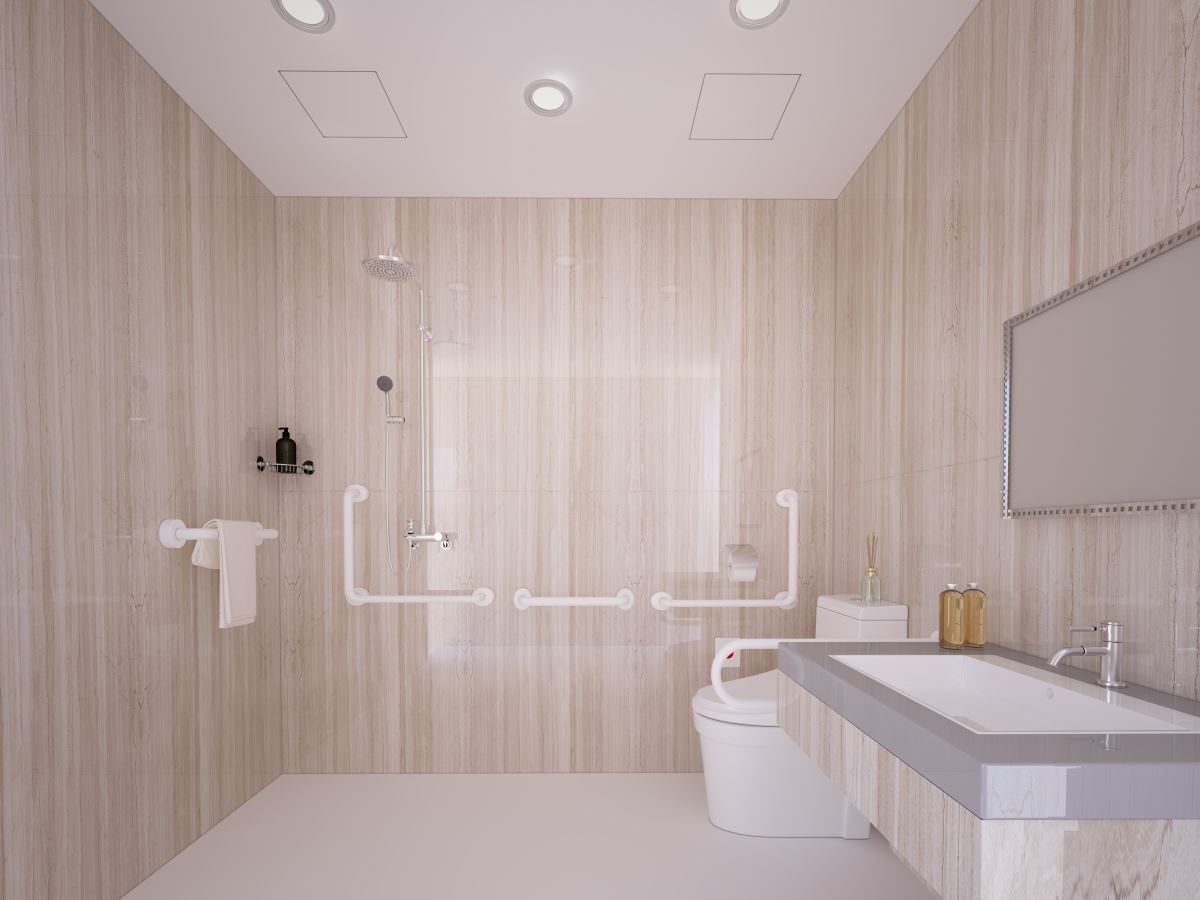 另外還有一個設計常常被忽略「洗手台加高檔水邊緣」,洗臉、漱口時常常會潑濺水灘,造成浴室周邊長時間潮濕、甚至地板濕滑導致危險的發生,所以「洗手台擋水加高邊緣的設計」使浴室環境更加安全。
