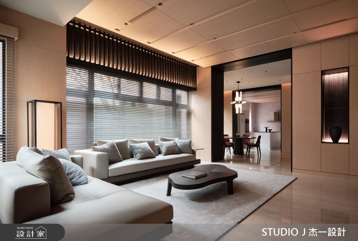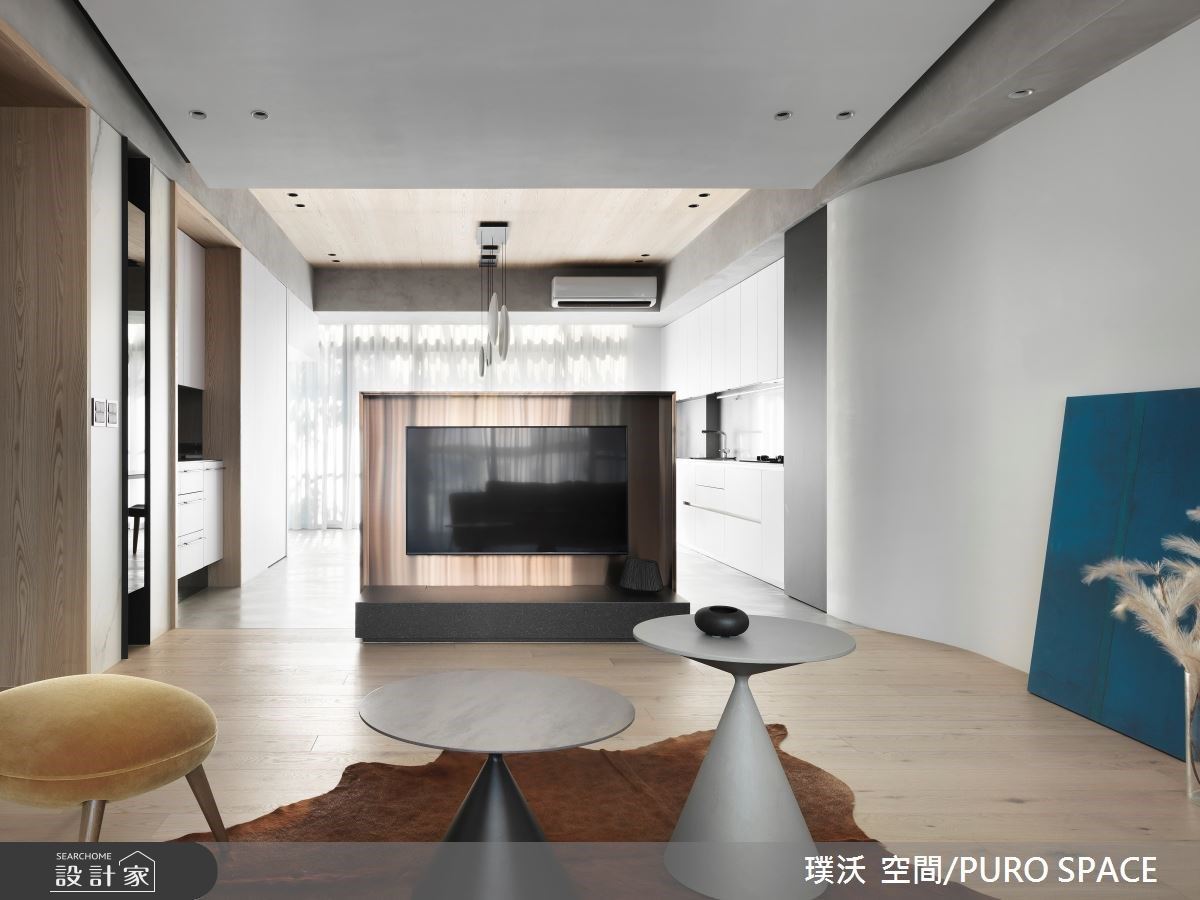 開放的公領域裡,電視牆以大理石紋理的系統板材拼接而成,灰鏡切割出漸層視感,消弭厚重量體,流露出細緻工藝美感;牆體兩側搭佐皮革材質,運用凹凸立體感的造型,強化整體電視牆的視覺層次;客廳裡讓灰色布藝沙發搭配圓形茶几,卡其色背牆融入深咖啡色系櫃體,局部設計展示空間,形塑內斂且兼具層次的時尚品味。