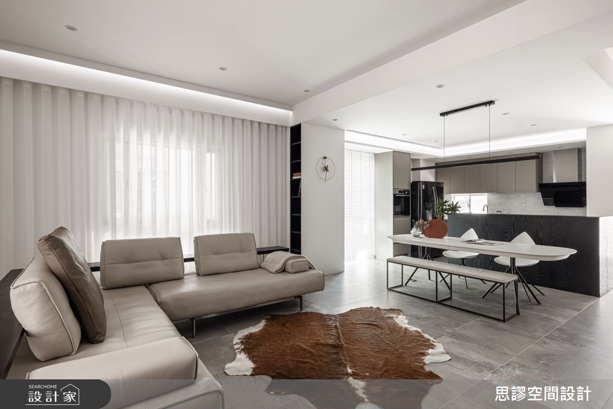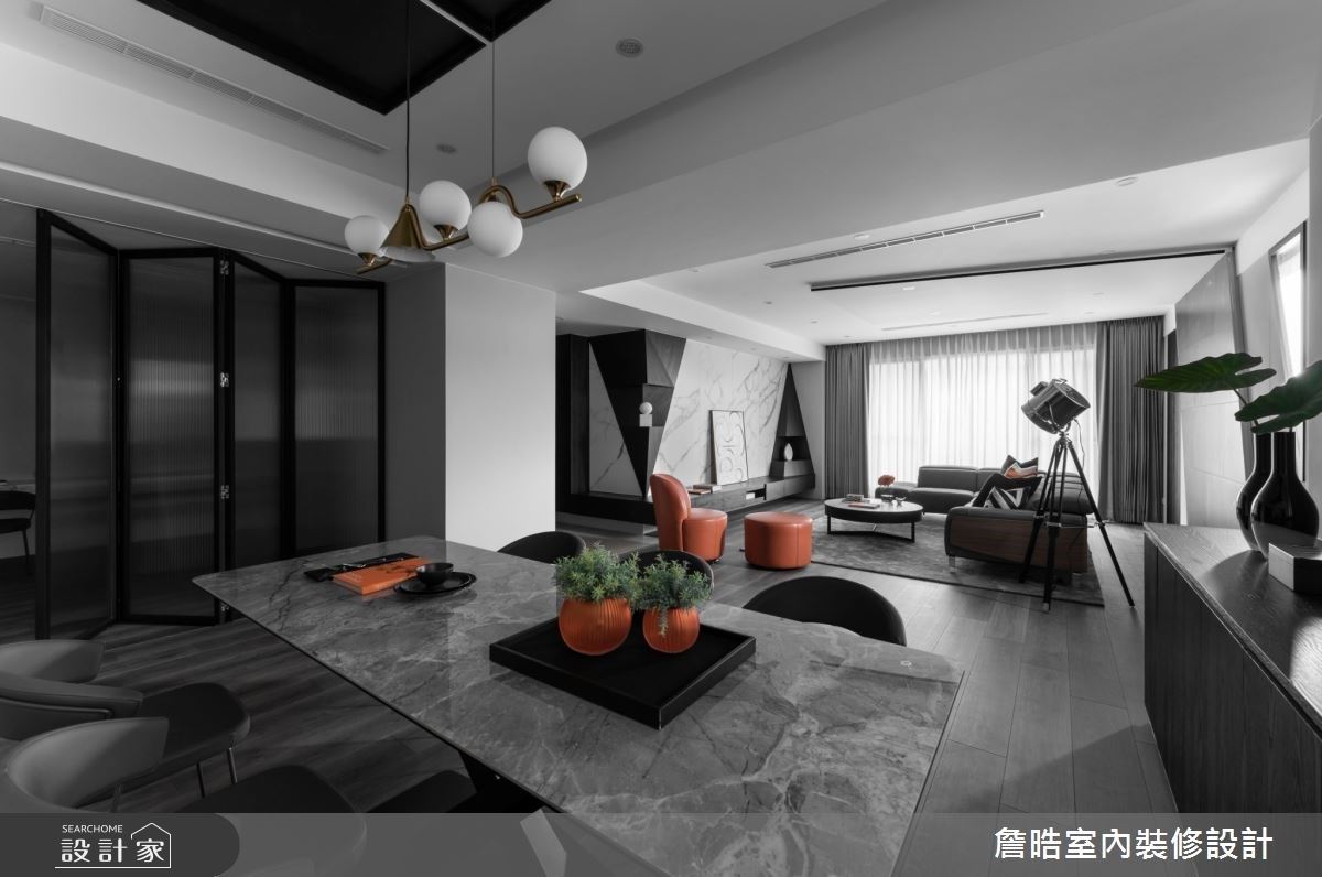 此案為80坪中古屋翻新設計,由於屋主的兒子喜愛具個性味道的現代風,因此整體空間以現代風為基底,透過黑白灰色調描繪一室,並揉入大理石紋造型的系統板材、鐵件、皮革與鏡面材質,交織出低調、質感的居家樣貌。