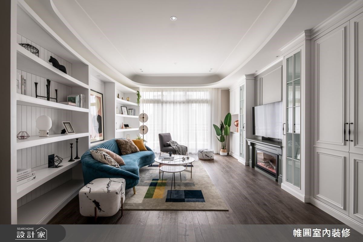 玄關廊道巧妙劃分公私領域動線,端景分別以細緻皮雕與藝術感十足的荔枝壁畫,詮釋品味個性。客廳以古典北法作為開端,天花板以木屋型式,化解樑柱問題。大面白色木百頁,引入充足自然陽光,搭襯白色雕花線板,營造優雅舒適氣息。電視牆獨立歐式壁爐,建構場域雙向動線,並整合美型收納,展現型隨機能的精湛設計。餐廳藉由土耳其藍鐵道磚搭襯白色餐廚,型塑南法的熱情奔放,餐桌緊鄰露台花園,讓屋主夫妻享受晨起日落日常美好。露台選用大葉植栽環繞各種繽紛花系,為喜愛歐式花園的女屋主,精心打造開放式空間花園。 主臥室以義大利百年教堂為靈感,浪漫雙開門營造主臥氣勢,汪哥更是借景戶外歐式穹頂建築,營造置身歐洲的度假氛圍。