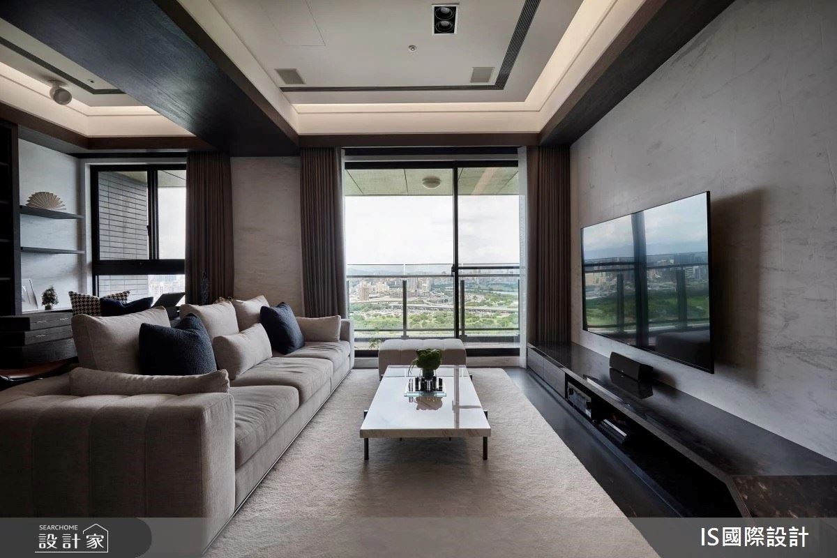 以玻璃磚、大理石紋為立面,結合局部鍍鈦材質的隔間牆,界定出玄關與公領域,且讓自然光穿透玻璃映照在花磚地坪上,再搭配水泥質感的鞋櫃,激盪出現代與樸實自然味道,成為絕佳迎賓風尚。深色木紋鋪陳公領域地坪風貌,搭佐愛馬仕橘沙發、木紋電器櫃與餐桌,調和一片溫潤質感,平衡大量以白色為基底的冷冽感受;白色大理石電視牆延伸天花視線,形成更開闊、明亮的空間感,牆面流露些許淡雅紋理,搭佐同風格的茶几與藍色漸層線條的地毯,交織一片人文藝術風采。餐桌與中島吧檯整併,成為家人凝聚情感的天地,而可容納多人座位的特點,更成為假日派對的絕佳場域。