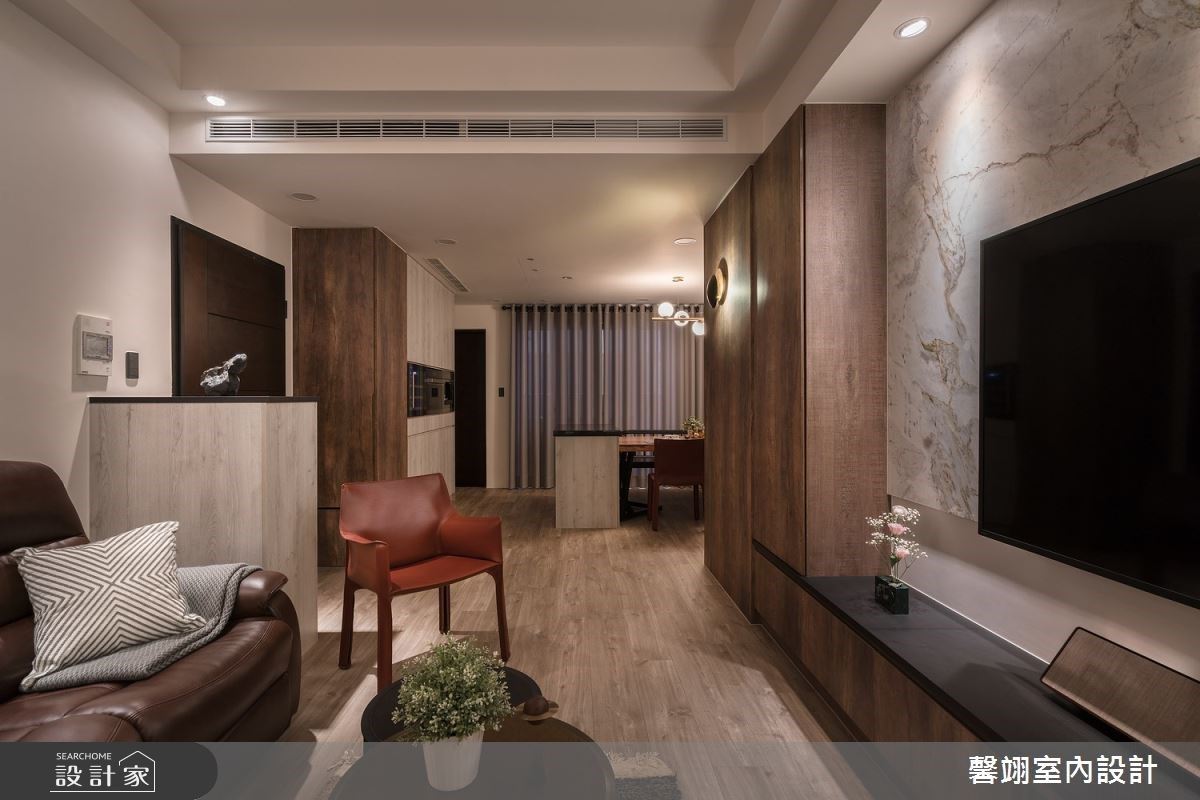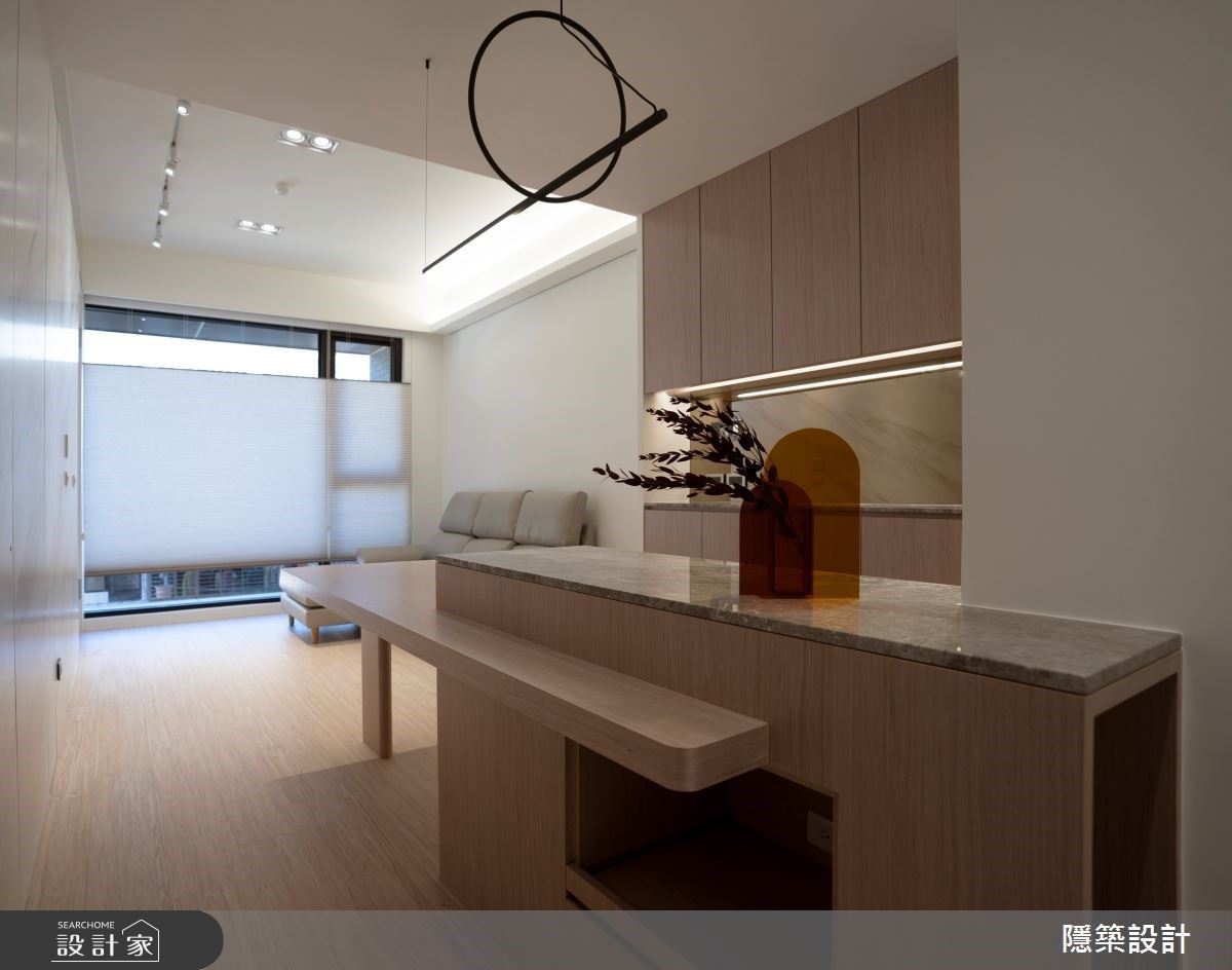 沐果設計為一家三口規劃井然有序又不失優雅的居家空間,相互交錯的線條凸顯現代風落落大方的精神。走入屋內利用鏡面反射創造視覺延伸效果,巧妙的隱藏通道的狹窄。來到客廳視線忍不住被沙發後牆石紋所吸引,隨興的線條宛如自由不受拘束的靈魂;刻意選用暖色調深色布質沙發,完美平衡現代風不經意的冷冽感。廳區落地窗掛上浪漫白色透光窗簾,陽光灑落的輕盈為室內注入通透明亮。