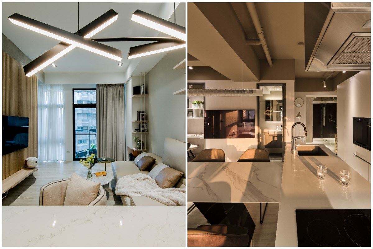 而為了提升室內高度,加值空間寬場感,由於此新成屋本身條件也很好,設計師透過刻意將局部空間露出樓板,以爭取室內高度,再搭配不佔空間且設計感的軌道燈作為整體照明燈。提升出來的額外高度,同時也造就電視櫃體上方能多一排收納書籍的空間,而整體收納的空間也非常足夠,特別採用系統櫃的電視牆櫃體,使上下左右的角落畸零空間都能放置居家用品。