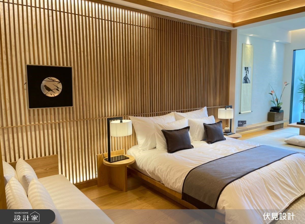主臥區域,空間色調由深入淺,兩面開窗一展庭院美景,擺上藤椅、米白皮件,營造出一絲輕柔舒緩的愜意感,讓人放下外在煩憂。