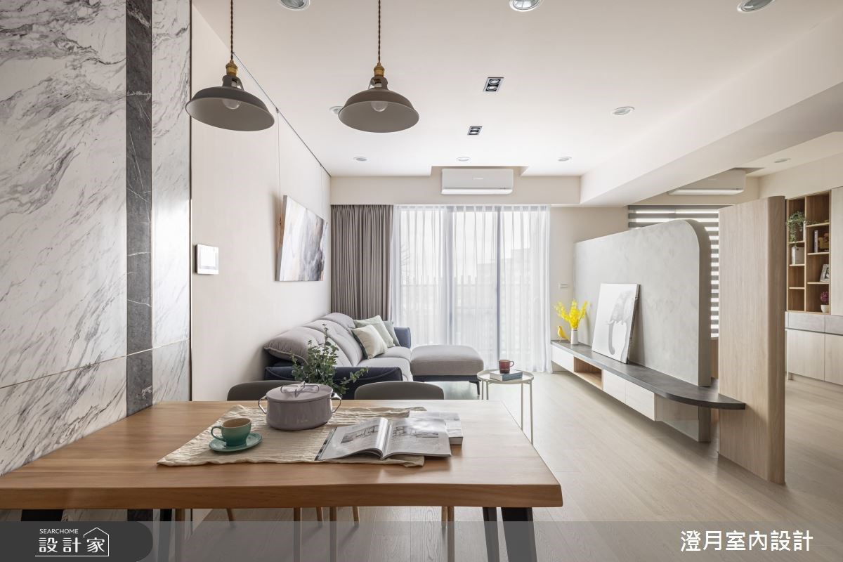 50 坪現代風新成屋的屋主從事包包設計,希望居家能夠兼具私人辦公室,因而設計師重新審視公私領域的空間擘劃,巧妙使用ㄏ字型的木作修飾橫樑,自客廳窗邊延展至餐廳區,放大了公領域的空間感。客廳打破制式的格局框架,透過雙面沙發的家具陳設,讓人擁有共享辦公室的開闊區域,而面對一整面收納櫃,屋主可以在多功能的休閒區,一邊運動、閱讀或聊天,一邊沉浸於美好的日光中。