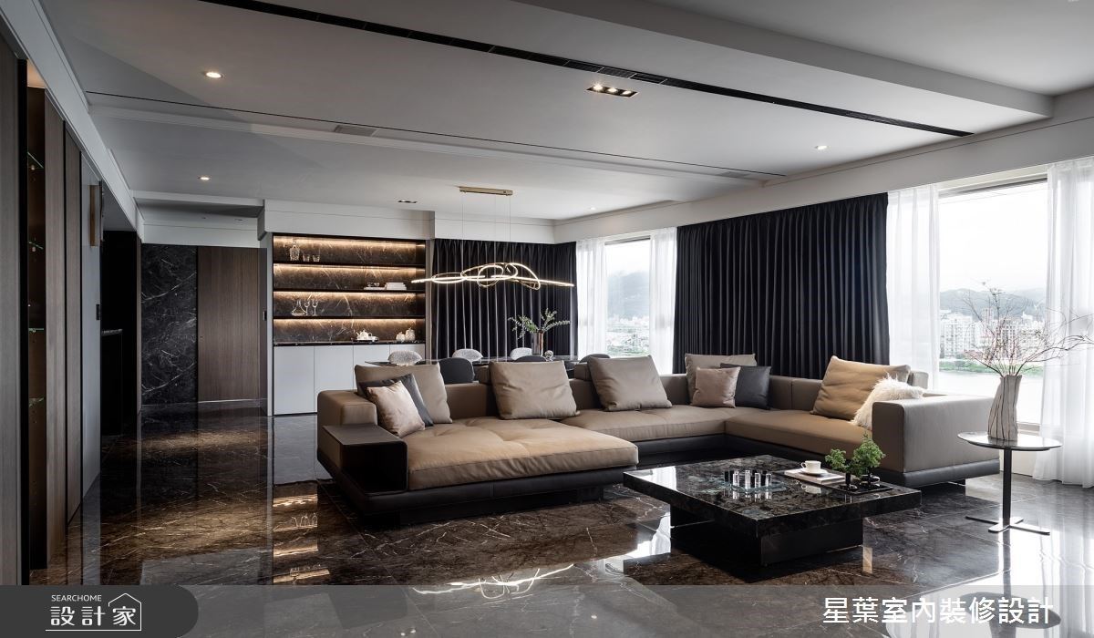 原為55坪毛胚屋,建築體外享有雲霧繚繞、山林綠意之景,設計師以屋主喜愛的現代風定調,開放公領域讓客、餐廳與廚房有所互動,增進家人情誼;開窗面延伸戶外景緻,並利用石材與木紋的原始美學,創造出內外情景相容。