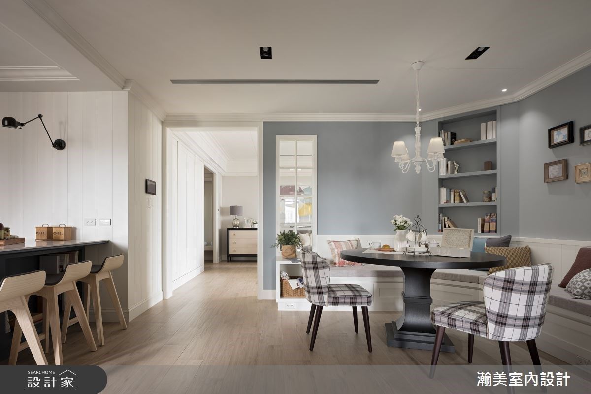 玄關領域利用沙發後方的矮牆設計,梳理出落塵區廊道動線,百葉收納櫃開啟美式風印象,給予四人生活充裕的收納容量。開放的空間設計,給予家人間高度互動性,首先迎來的客廳領域,由天花的格狀造型線板,有效修飾室內大樑並替美式住宅增添層次與細節;霧灰質感的電視主牆整合電視機櫃與書籍收納,兩側對稱且開放的層架設計,搭配跳色沙發,替客廳帶來大器卻輕盈有趣的視野。開放格局內運用空間色系,餐廚領域的莫蘭迪綠調,迎來清新寧靜的生活氣氛,倚窗安排的臥榻式用餐座位,白天沐浴在陽光下,有如在咖啡廳享用早午餐般愜意。餐廳與廚房之間,透過中島吧台串連烹飪區與用餐區的連結,並提供備餐、收納、品酒、下午茶等多元機能。而開放式廚房設計,藉由花磚地坪、鐵道磚、線板門片傳達出十足的美式風情。