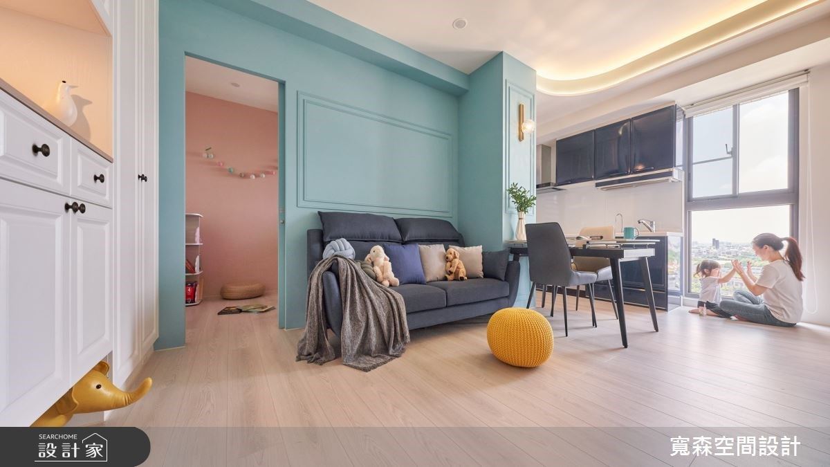 屋內主體以溫暖的鵝黃色為主調與木質調家具相呼應,佐搭具收納功能童話風茶几;順著動線深入屋內是以清新的Tiffany綠作為端景牆所營造的餐廚領域,省去空間過多的擺設利用減法工藝創造空間放大感。