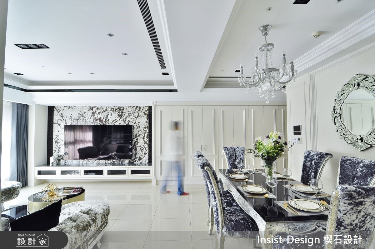 參考歐美大宅的玄關設計,透過廊道預留進出的緩衝地帶,即使敞開大門,也能留有完整的隱私感,牆面則運用美式線板抹去收納櫃的存在感,兼顧美感與實用的需求。推開玻璃雙開大門,來到寬敞開放的公領域,落地窗面所帶來天然好採光,隨即為整體塑造大器視野。半高電視牆作為客、餐廳的分野,卻不阻卻流暢的氣息和光影痕跡,而沙發背牆以純白、裸灰交織,掛上〈戴黑帽的男人〉,瞬間型塑高雅的藝術品味。餐廳區域,以玻璃為書房輕隔間,讓空間能向內裡延伸放大,懸吊燈飾選用放射性的幾何線條,取代傳統的水晶燈印象,搭配天然大理石檯面,流露充滿時尚氣息的現代感。