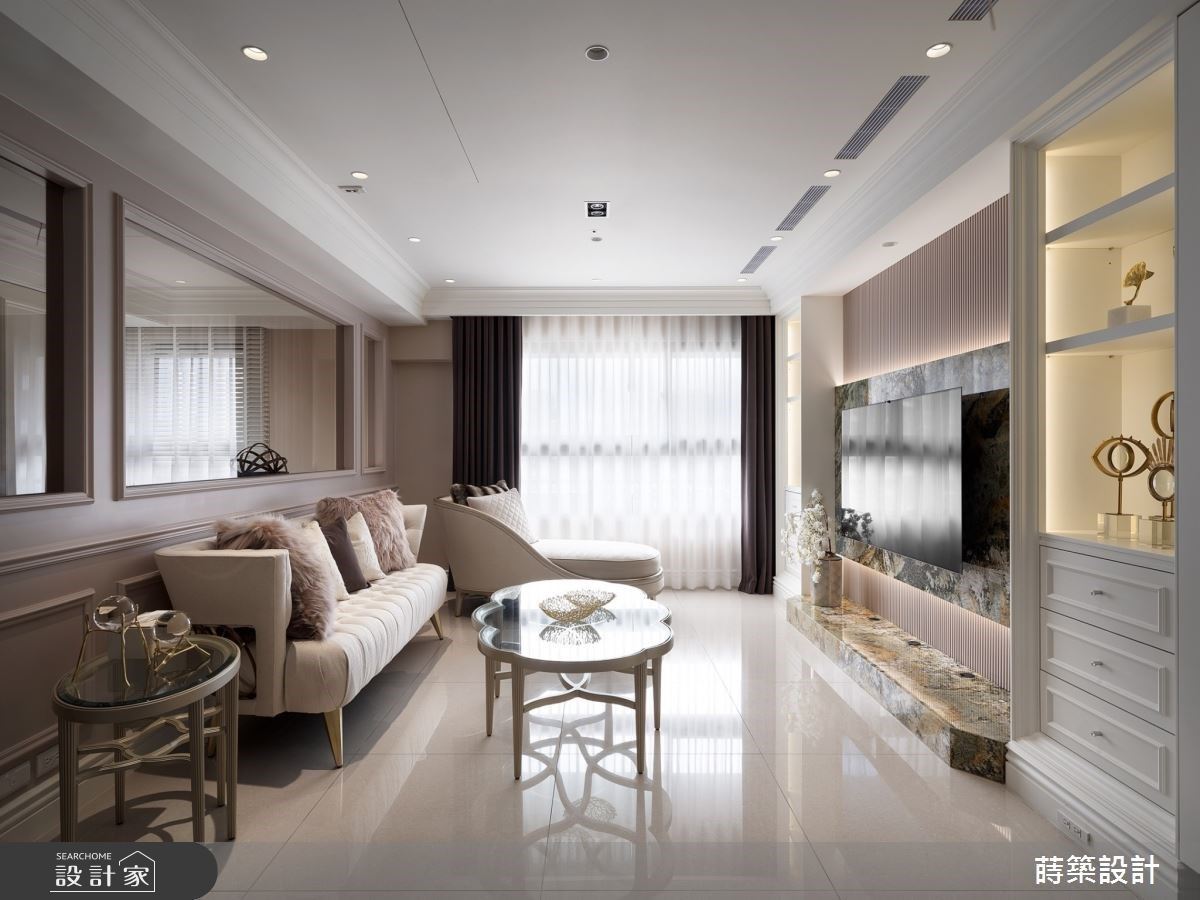 而美型收納不僅能滿足需求,更能打造出特色端景面,電視牆旁的展示櫃以琥珀鏡襯托精緻面貌;餐廚空間的收納櫃體則事先預留家電大小,而主臥室的更衣室門片巧妙藏匿於柔美線板內,無形中虛化場域間的分界。