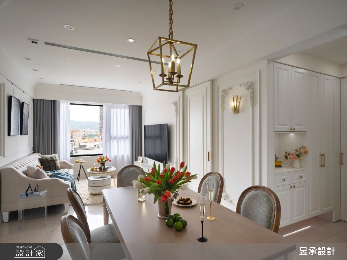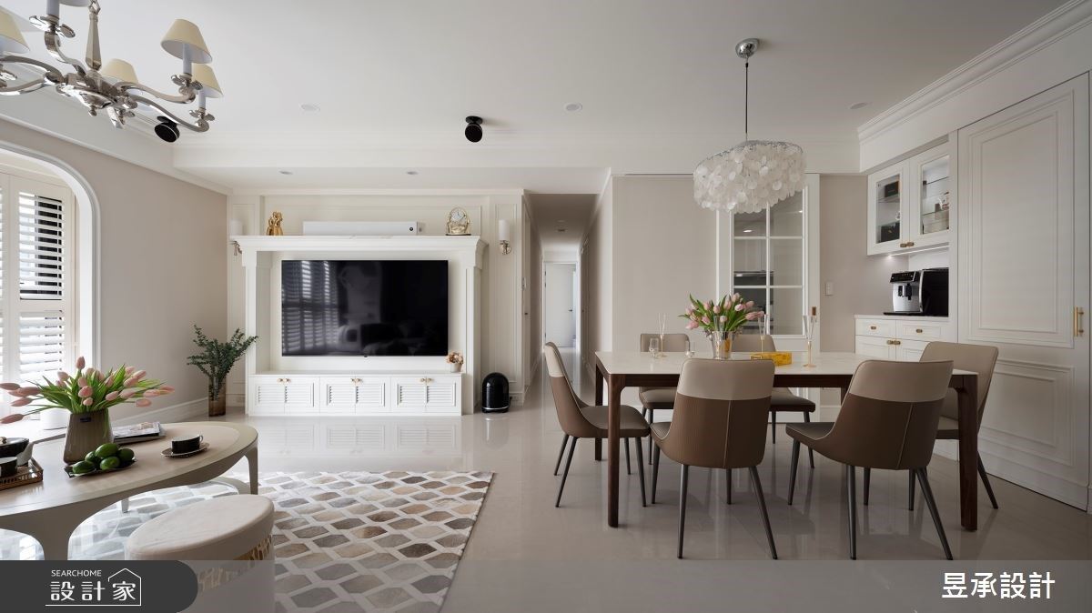 36坪美式新古典風,得比空間設計 侯榮元設計師,深入了解夫妻倆的生活習性,規劃出符合成員數的空間,發揮居宅空間的最大坪效,並以溫柔杏調為空間主色,牆面搭佐線板元素,營造出滿室的細膩感與層次變化。