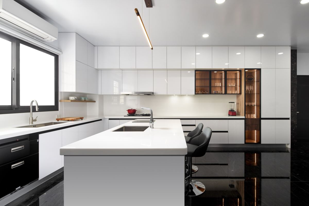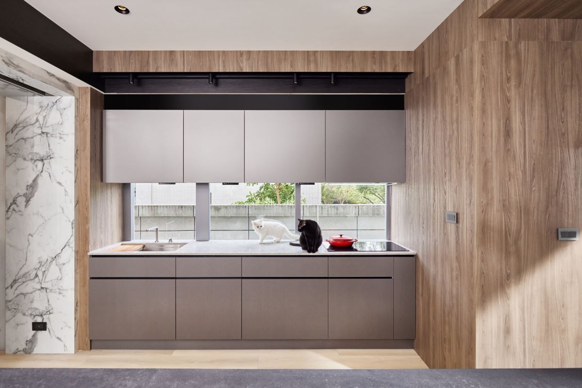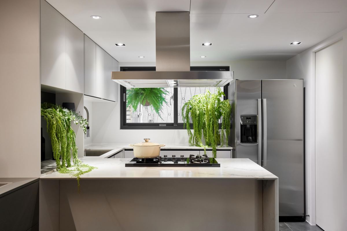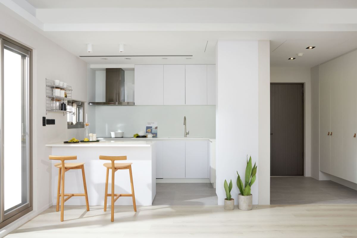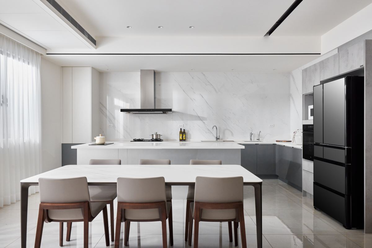 餐廚機能整併,中央搭配白色人造石中島吧檯,拉出寬敞的行走、烹飪動線與饗食空間,展現簡約舒適的廚房領域。