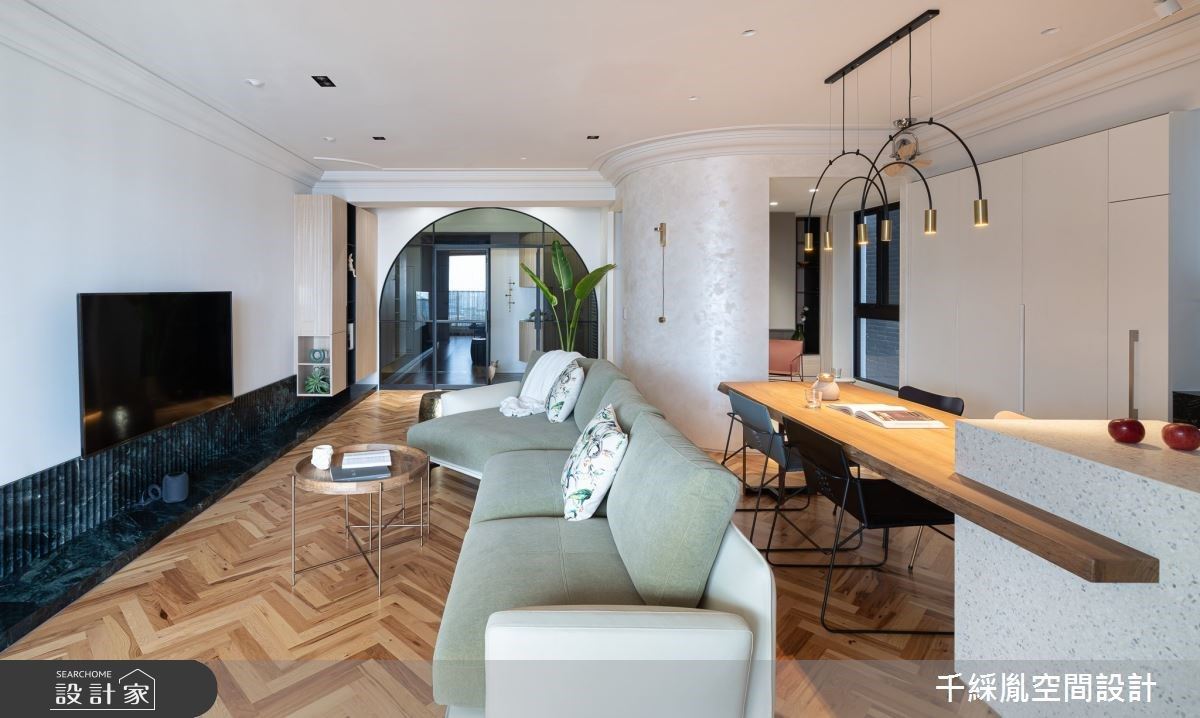 一家四口與七隻毛孩的生活中,期許每位家庭成員的活動空間都能舒適自在。98 坪混搭風住宅內,格局規劃方向以無隔閡、無落地差的設計,發揮大坪數空間優勢,不僅公領域,私領域空間也透過敞開的格局設計,引入舒適充沛的採光與放鬆山景;單純的行走動線也便於寵物跑跳、休息日常。