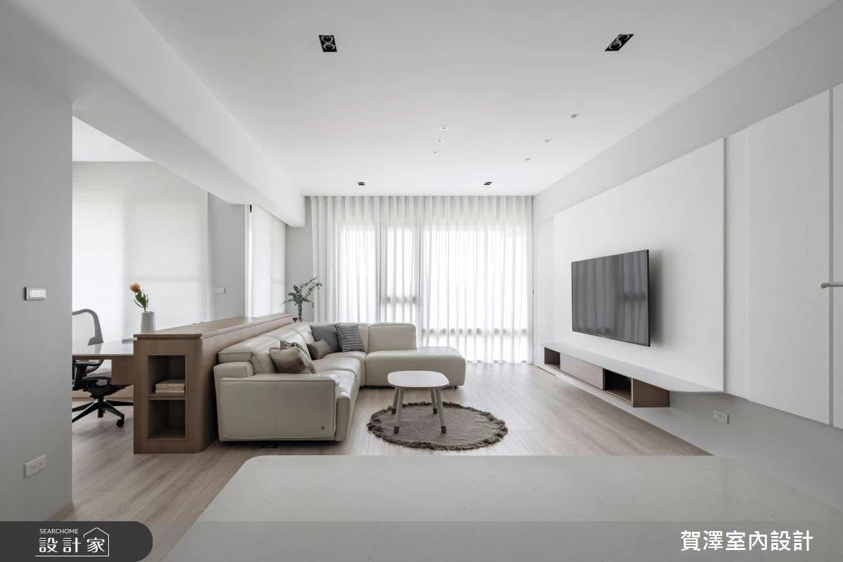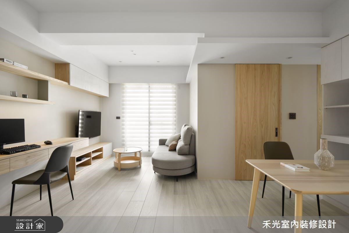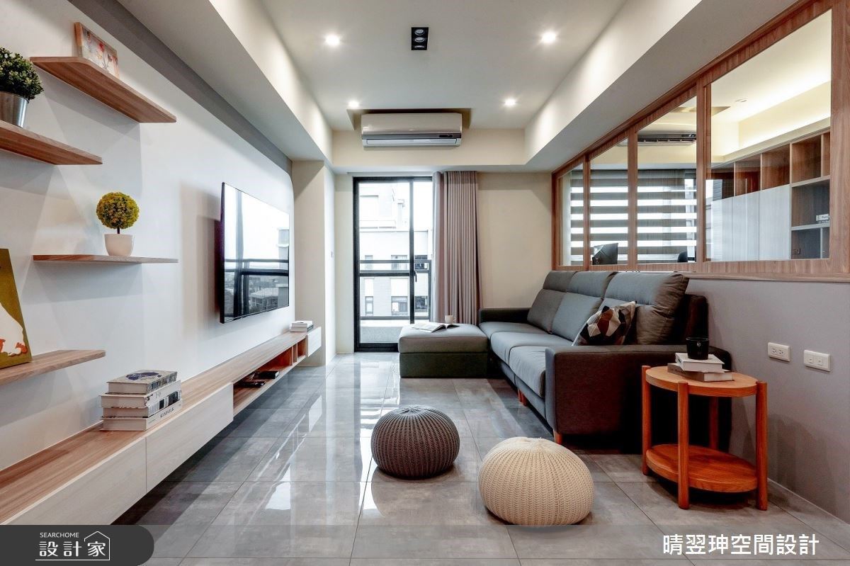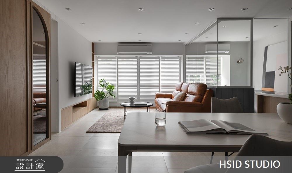 設計師擅用材質和色彩堆疊,增加空間的暖度與層次,木質感為基調,格柵、透氣孔、洞洞板及自然紋理,共同營造視覺變化,客廳背牆及電視牆跳色,成功打造視覺焦點。