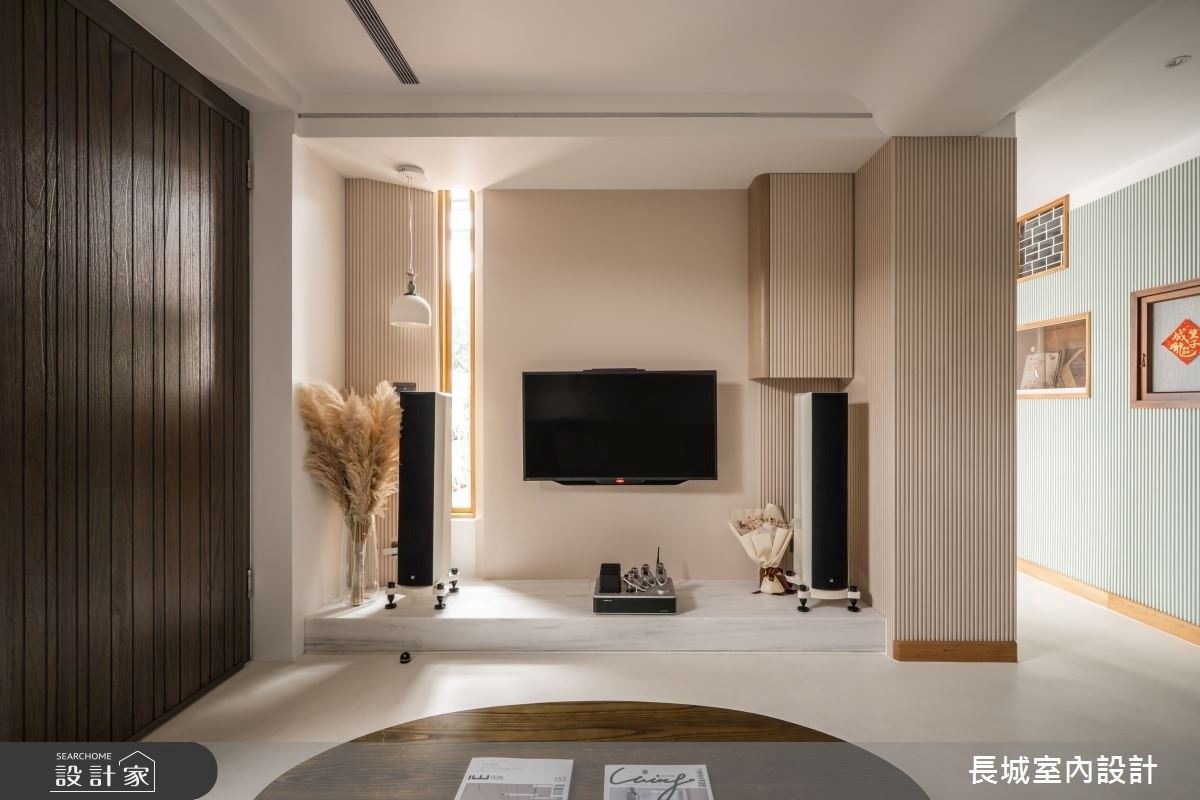 客廳以白色作為主調,搭佐深灰調大理石,優雅大器氛圍不言而喻。除了設置落地窗援引大量日光之外,設計師更是利用古銅色亂紋鍍鈦板裝飾牆面;帶有金屬色澤的古銅搭配時尚高貴的大理石,空間頓時增添一抹異樣風采。大理石電視牆與身後的古銅鍍鈦板及原木相互搭配,營造豐富層次感。