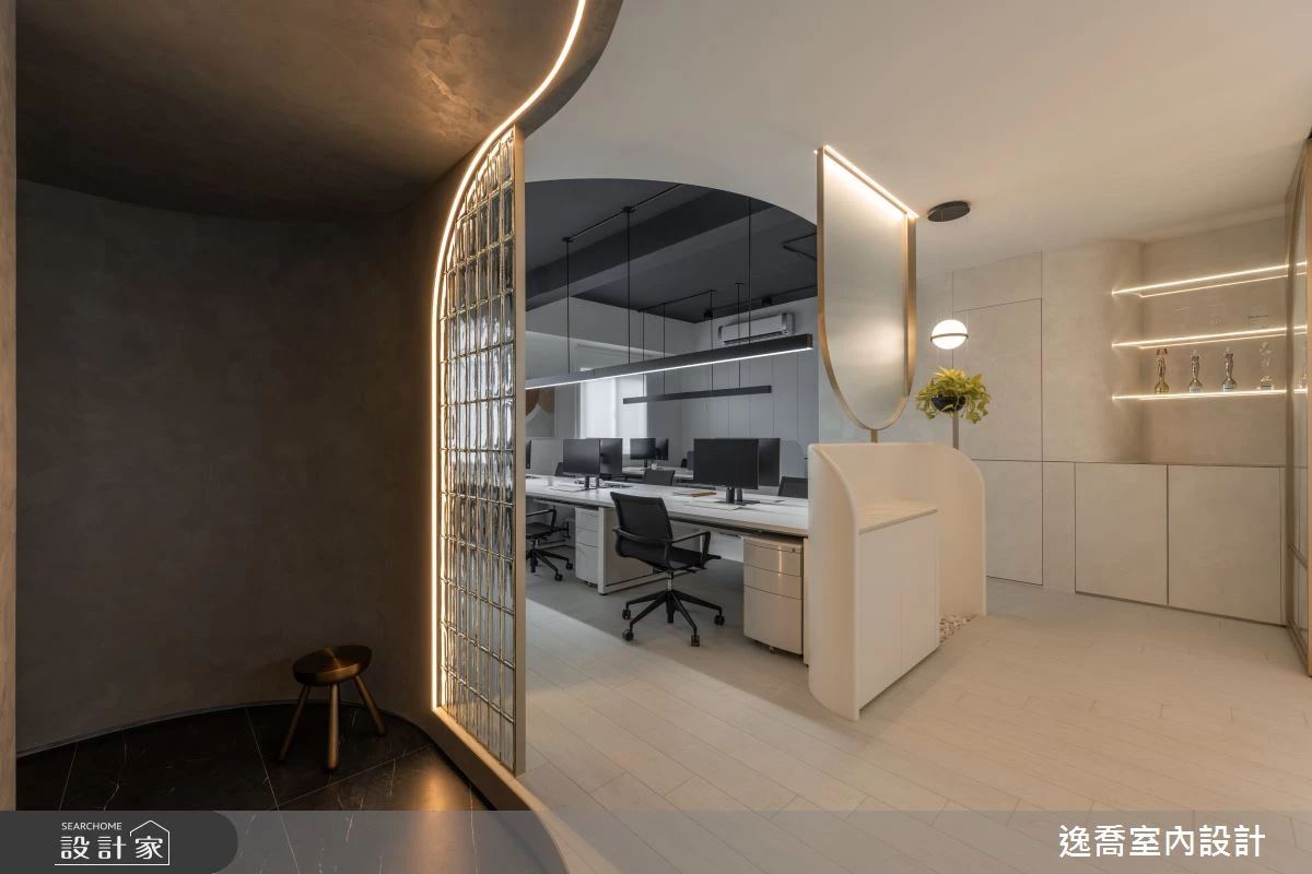 將辦公空間的公用區域整合於空間中央,形成大型的回字形動線,廊道結合圓弧語彙,不僅擁有更順暢的移動軌跡,踏入空間後的驚喜感也不曾消減。