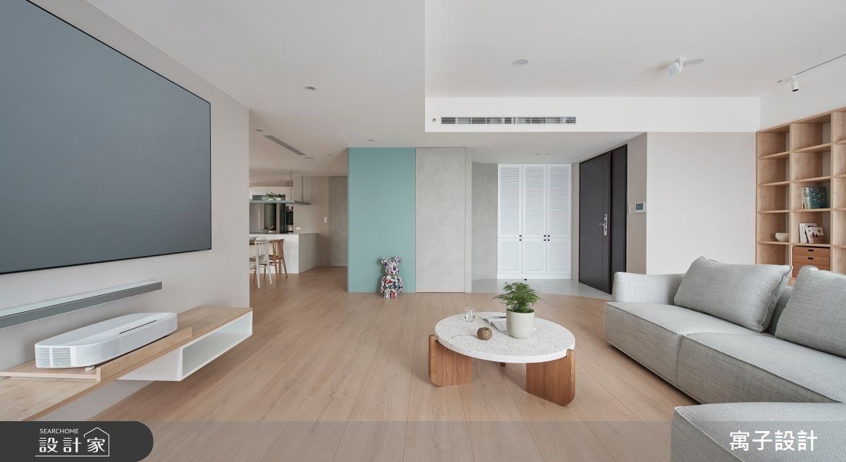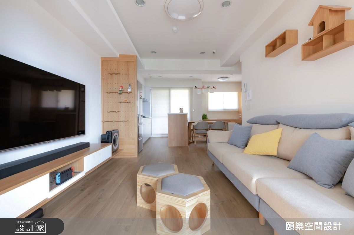 進入玄關後以木格柵牆面、石材鋪陳作為起始,客廳則以白色系為基底,搭配使用木地板與木質壁面、家具鋪敘滿室溫暖質感,設計師更發揮巧思,讓FRP方格板既做為穿透式隔間,更將其定製為客廳裡的大小桌几,簡潔具有美學的佈置,實現日系家居的清新氛圍。