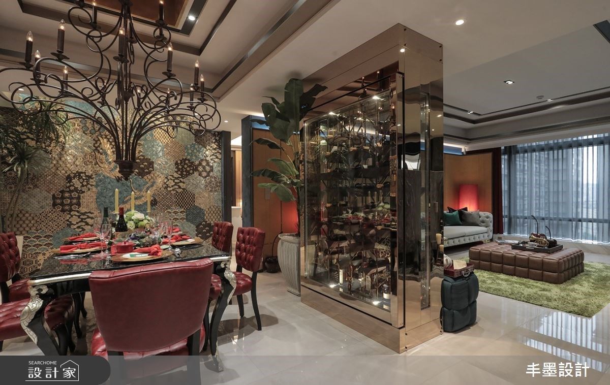 調飲酒吧以大理石中島為重心,多種建材與色彩於立面上堆疊出豐厚的設計層次,營造出在家也能走入異國酒吧的悠然愜意。