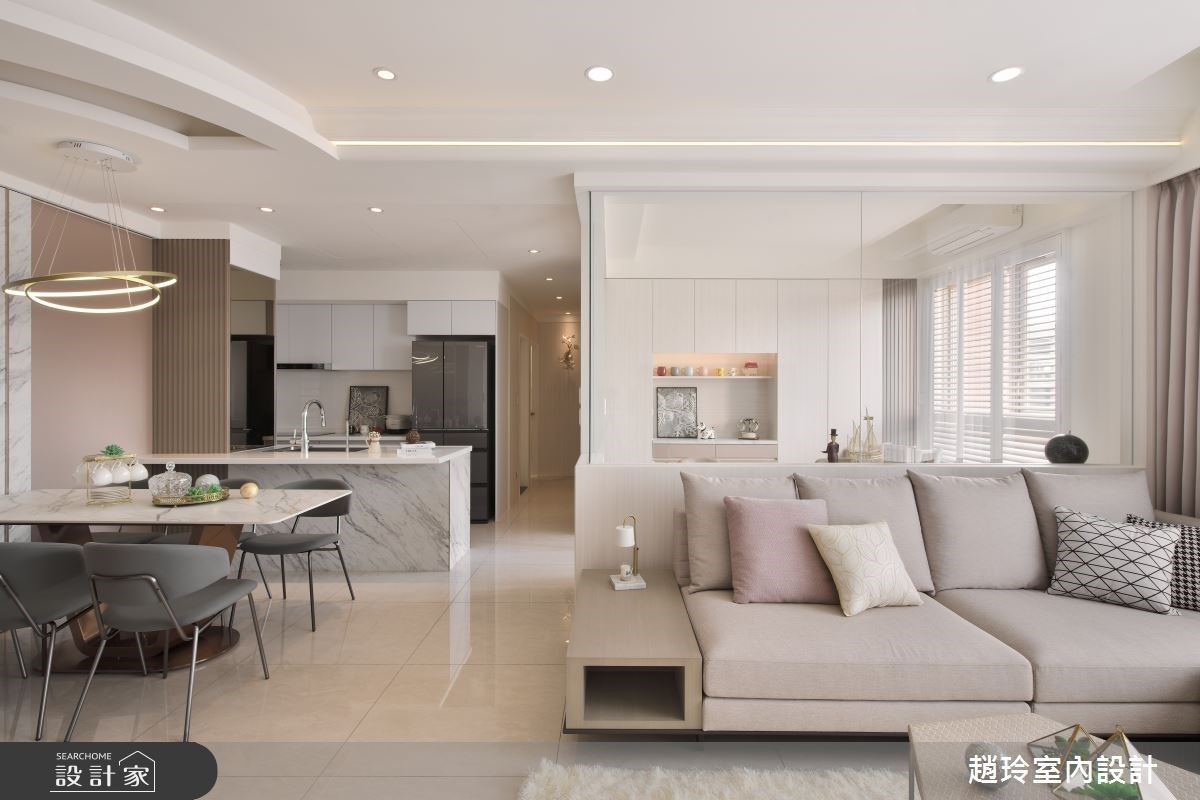 35 坪新成屋原始格局安排上,公領域為全開放式設計少了隱私也有風水疑慮,設計師在入門處砌一座隔間牆,木皮與鏡面反射廊道,輕隔間設計也讓客廳採光能映照到落塵區,底端的雙面櫃體能創造玄關端景也能作為電視機櫃。型客廳擺放 L 型沙發形塑寬敞的休憩空間,背後以大理石打造半高牆,形塑開放式的書房空間,窗邊還配有臥榻。