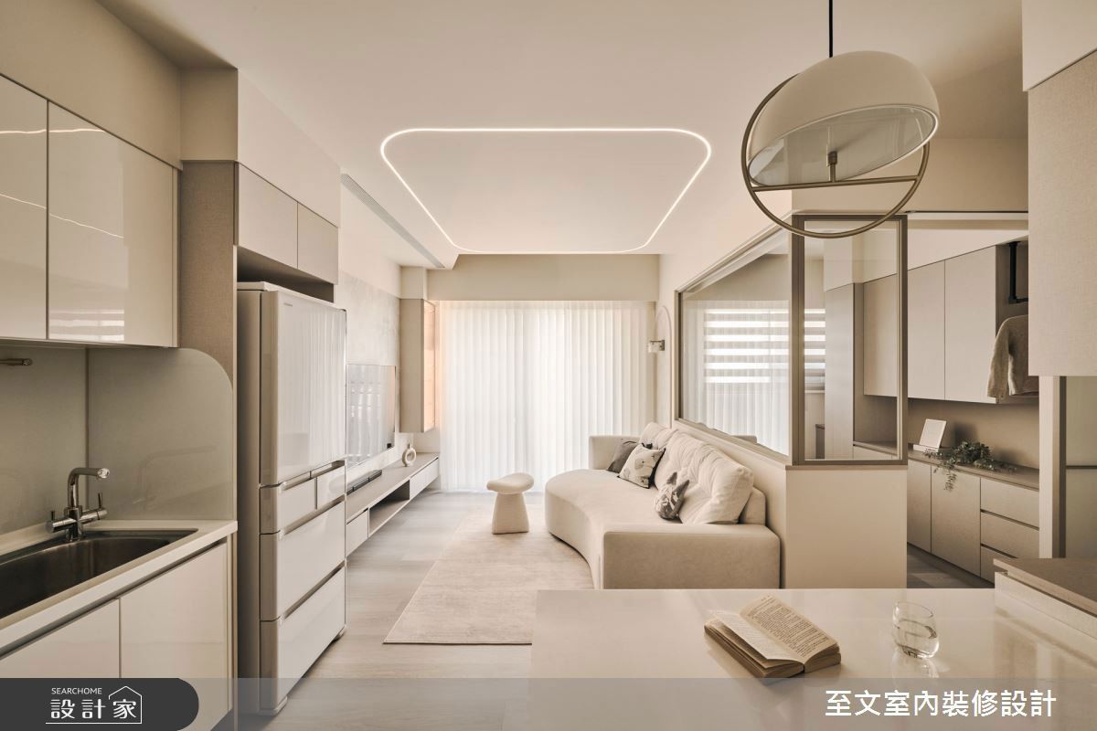 因既有建築結構的分布,容易造成屋內有壓樑的問題,設計師巧妙運用弧線造型和天花板的層次設計,不僅讓空間看起來更高挑,也消除了樑柱的稜角銳利感。