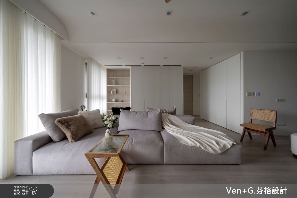 因為屋主具有大量的收納需求,從玄關、客餐廳、廚房,直到臥室,皆置入了非常充裕的收納櫃體設計,為了化解儲物櫃帶來的壓迫感,也希望使空間看起來更加放大,設計師導入斜角設計增加可利用的空間,廊道動線也變得更加流暢,結合隱藏式的門片設計,營造簡潔、俐落的居家畫面。而電視牆左側更利用樑柱的深度,設置媲美儲物間收納量的櫃體,旁邊則規劃內、外雙層的移動書櫃,為屋主大幅擴增書籍的收納區。