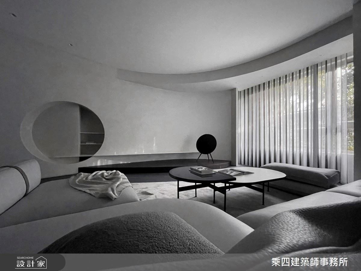 進門玄關以圓弧造型圍塑藝術端景區,並藉由波龍地毯到全室木地板的鋪陳,帶給人踩踏時的舒適感受。客廳結合大面露台及開放式書房,營造開闊視覺效果,並透過設計融合大理石及精品櫃,締造展示收藏的藝術牆面。