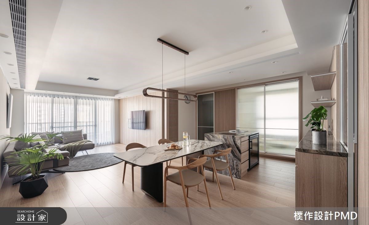 來到客廳,L型的柔軟布沙發後方,格子狀的收納展示書櫃,透過淺木、純白的門片交錯,加上開放、封閉的不規則排列,呈現充滿節奏感的動態視覺,不但給予充沛的收納機能,也勾勒吸睛的牆面端景。客廳與廚房的交界處,天花運用木作包覆、弧形設計,嵌入迷人燈帶,在不影響屋高的情況下,成功抹去樑柱的壓迫感。廚房區域,巧妙配置中島吧台,寫下ㄇ字型的料理動線,能擴充調理檯面,更可隨時化身小酌談心的角落。