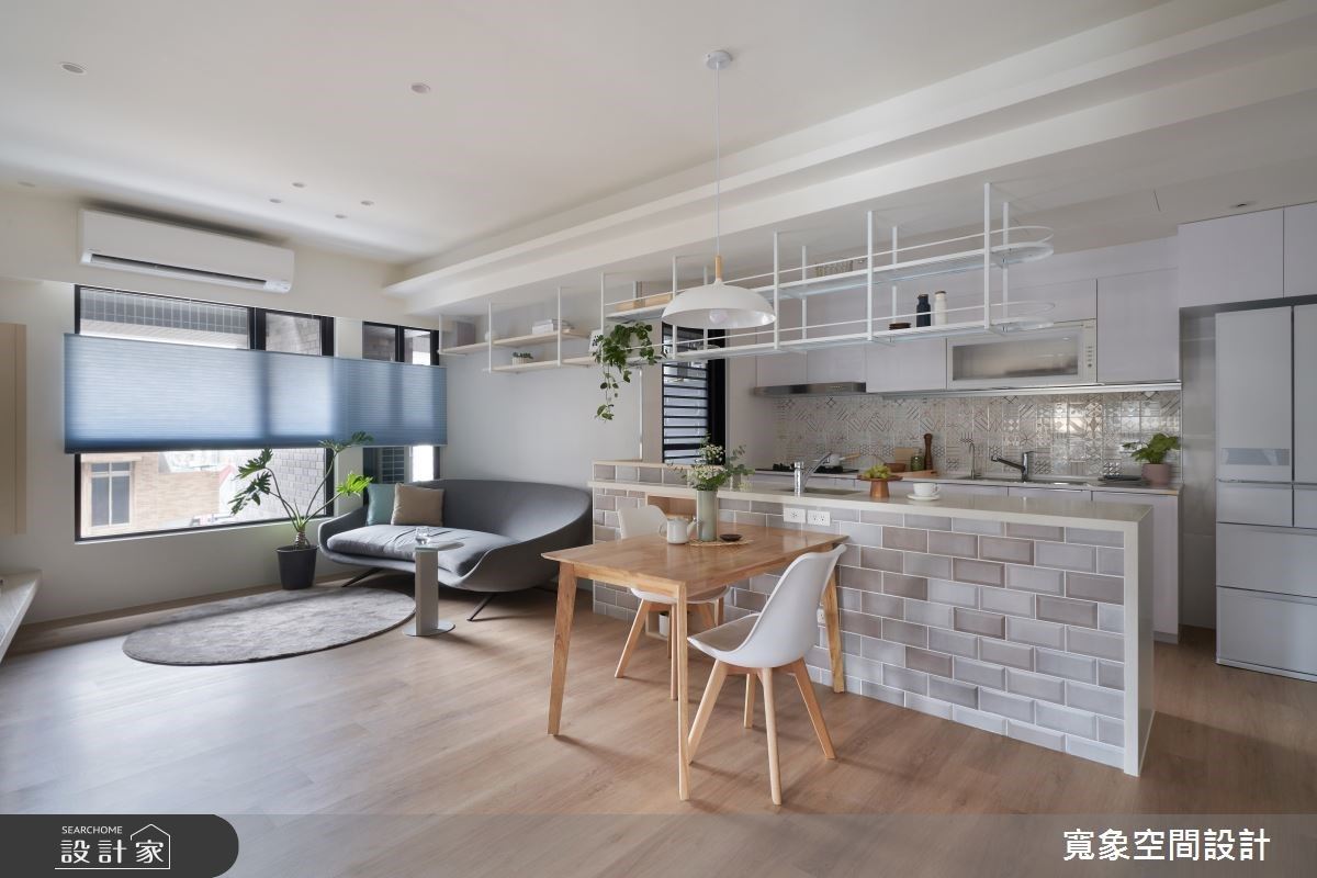 輕盈透亮的白淨基底裡,湖水綠沙發率先帶入沁涼清爽的夏季氛圍,深海藍中島吧台搭襯大理石切割的拼花牆面,一深一淺間鋪排高雅質感,透過色彩、線條與材質的細膩佈局,譜出生動、個性十足的趣味場景。沙發後側的書房區域,外觀結合白線格柵與清玻璃,直率的幾何線條和通透材質交錯,勾勒清新明亮的窗櫺造型,而隔間機能也帶來全面的隱私性,內裡加上三角斜切書架帶來一絲穩定性,為親子間創造屬於彼此的閱讀時光。