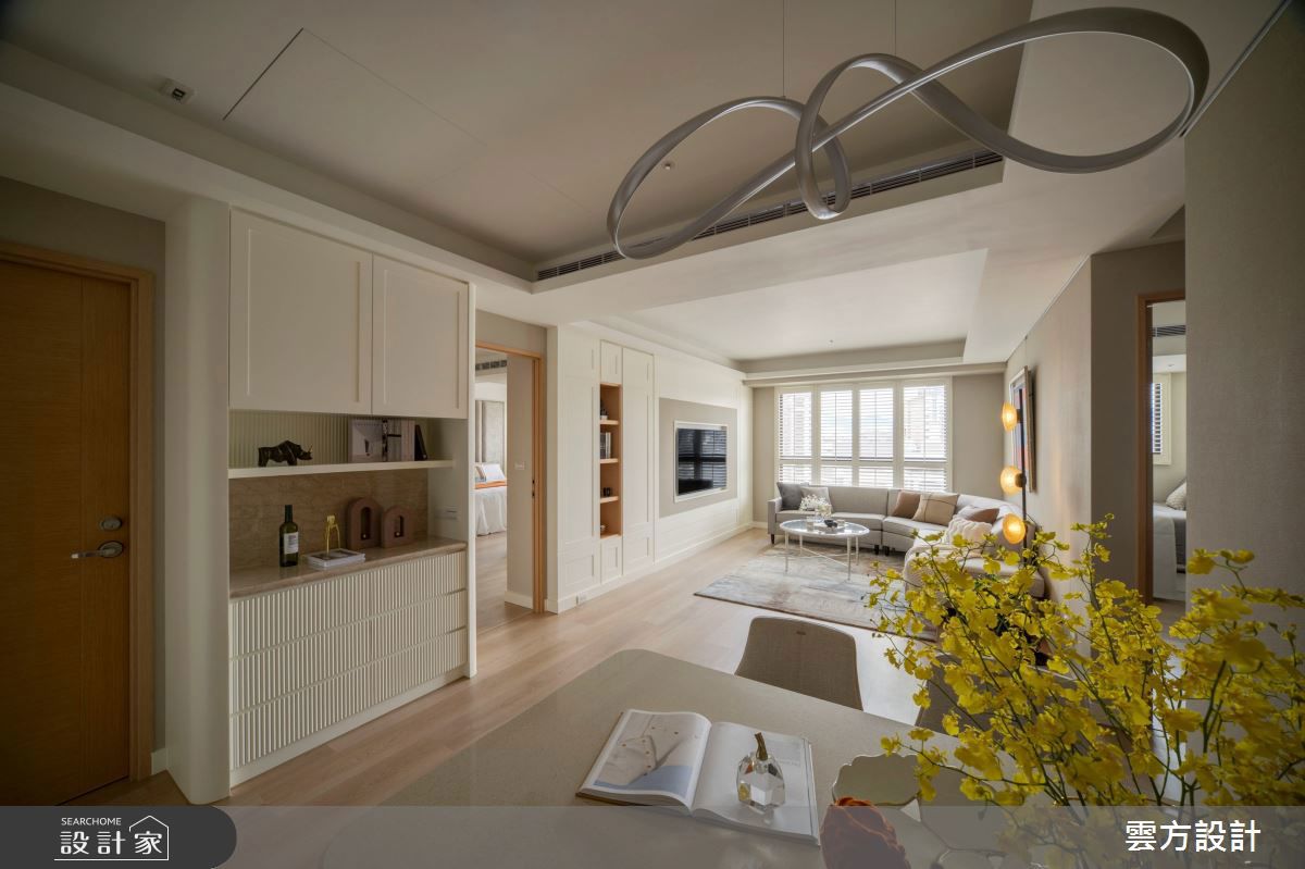 以純淨白搭佐深、淺駝色作為全屋主調,在LED光帶的照映下隨之閃耀,營造輕盈優雅質感。玄關穿鞋椅為電視櫃延伸,保有整體空間俐落感,上方櫃體則打造圓弧邊角,降低視覺厚重感。電視牆則選用尤加利木皮材質;輕輕一推,便能發現更衣室隱藏其中。考量到生活型態亦會隨著時間改變,設計師選用特殊五金材質,屋主日後可依需求調動間格大小。地坪利用深、淺木紋材質無形劃分客餐廳場域,減少不必要隔斷卻同時保有其功能。步入餐廳,純白的餐桌彷若羽毛,將心頭的煩擾一掃而空。悠然懸空於上的水母造型燈更營造溫潤舒適的用餐空間;鄰近的備餐檯兼具收納功能。考量到屋主的小朋友年齡尚小,廚房則採用不開放式。