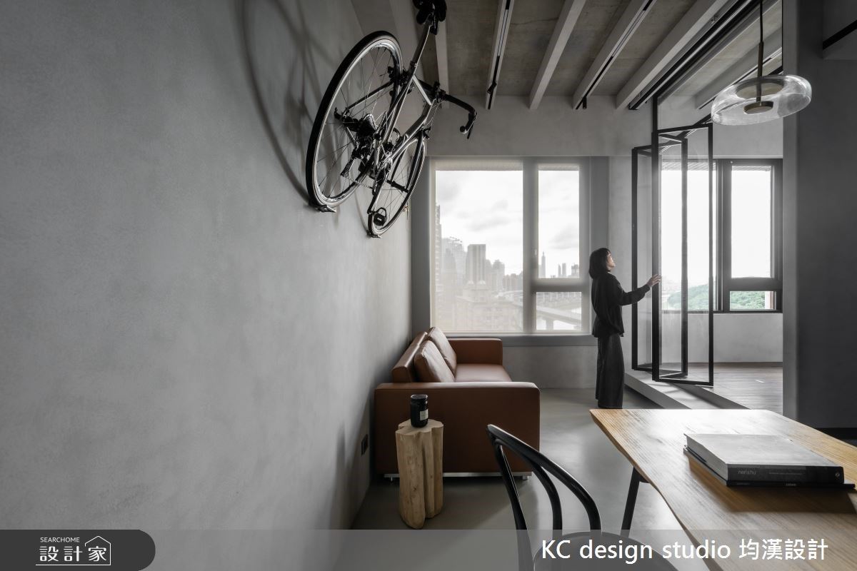 18 坪的預售屋內配置 2+1 房格局,為了創造更寬敞的居住體驗,設計師將靠近客廳的臥房隔間改為半開放式的茶玻鐵件帷幕,創造通透但有一定隱私性的設計。