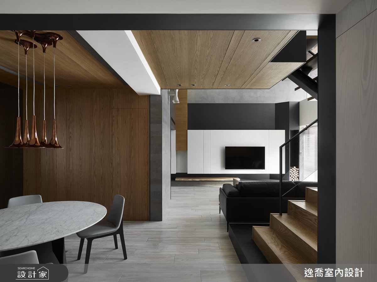 喜歡下廚也相當好客的男主人期望能有個超大餐廳,考量地下室佔地較大,比一樓更適合規劃成客廳、餐廳、廚房等交誼空間。天井透著日光映照入內,往下的樓梯特別以鐵件和孔洞,製造出光影穿透感,一字型的廚房配置烘烤設備,黑鐵檯面的中島搭配舊木長型餐桌,擴充料理檯面,朋友來也可坐得舒適,造型獨特的防爆燈點亮懷舊氛圍。