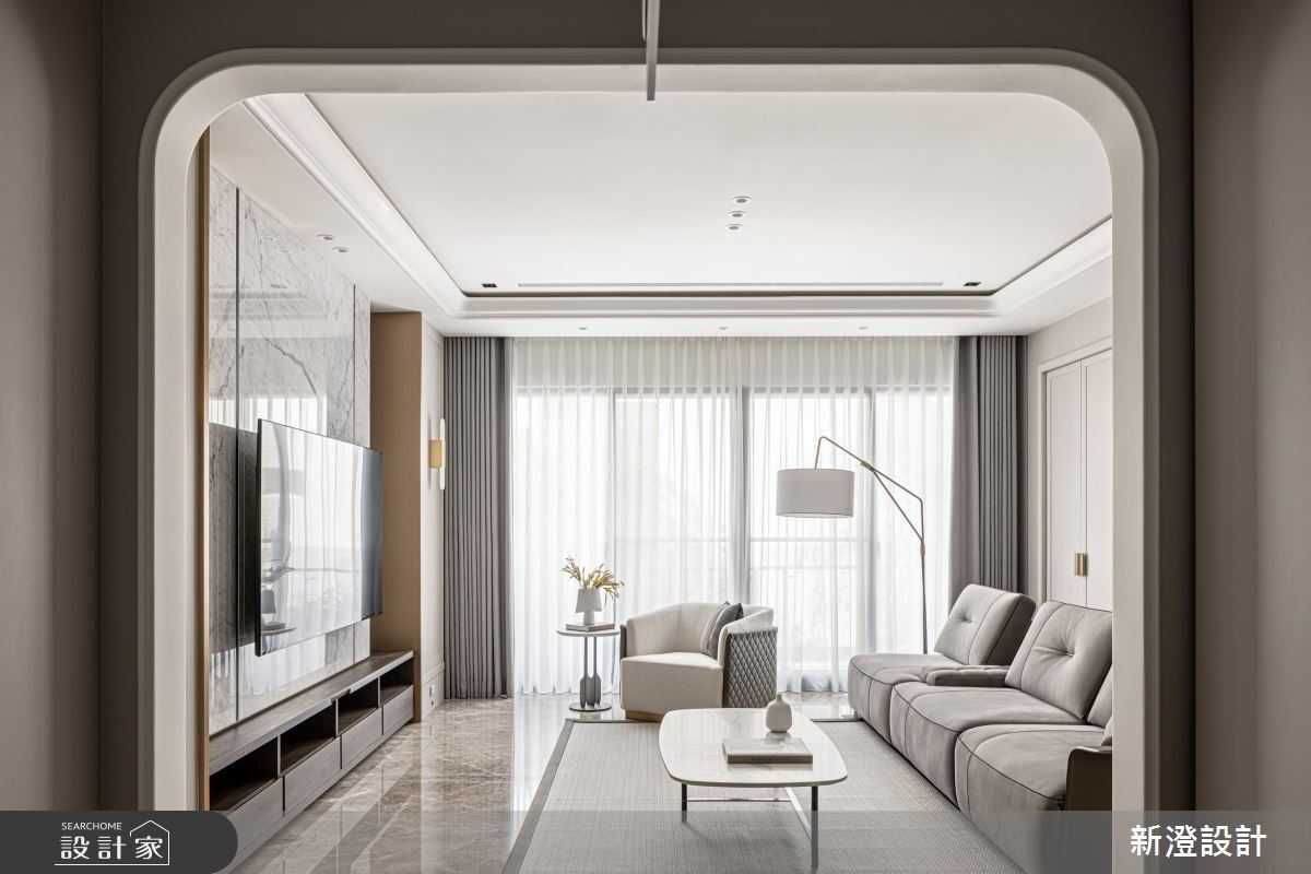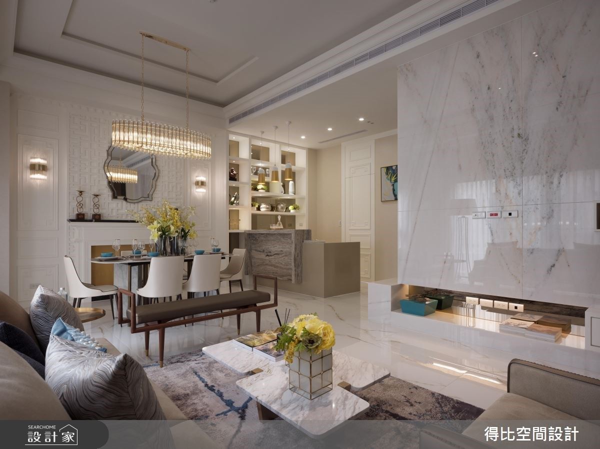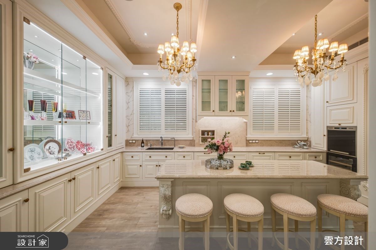 開放式設計串連客廳、餐廳、廚房,讓空間更開闊,客廳與餐廳間以訂製的半高沙發背牆作為場域區隔,視覺通透並放大空間感,半高牆面同樣以簡約的線條呼應新古典風格的調性,餐廳區華麗的垂吊燈飾散發出雍容華貴的氣息,照亮一室的溫暖。廚房下櫃以木質門片也增添溫潤感。