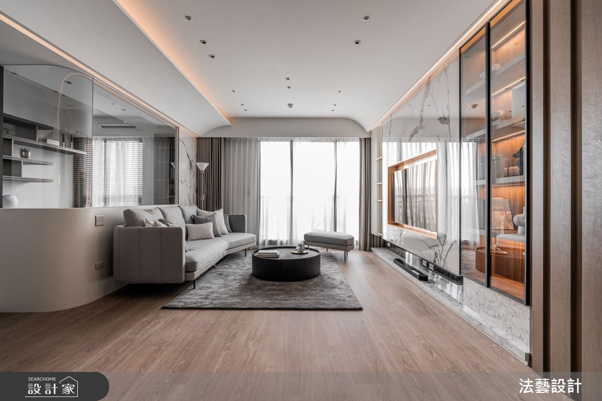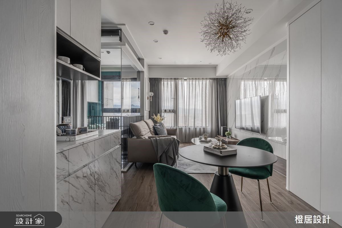 亮眼黃色游走在大樑結構,同色系單人椅巧妙呼應;而電視牆更選用黃、灰色調的石材,躍升為視覺焦點;跳色抱枕與繽紛地毯的點綴,擦亮視覺新意;餐廳再安排一道綠色烤漆立面,挹注美學戲劇張力。
