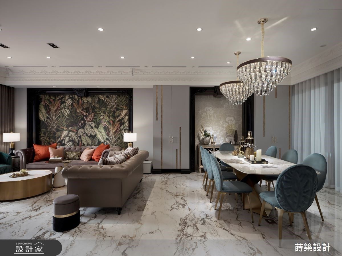 80坪新古典空間裡,引戶外自然光,映照在白色調襯底的優雅細節上。簡約線板遊走在天花、牆面與櫃體,而大面獨特紋理的石材彰顯非凡氣度;局部搭佐鏡面、鐵件,在典雅氛圍中佐入漸層的視覺美學。