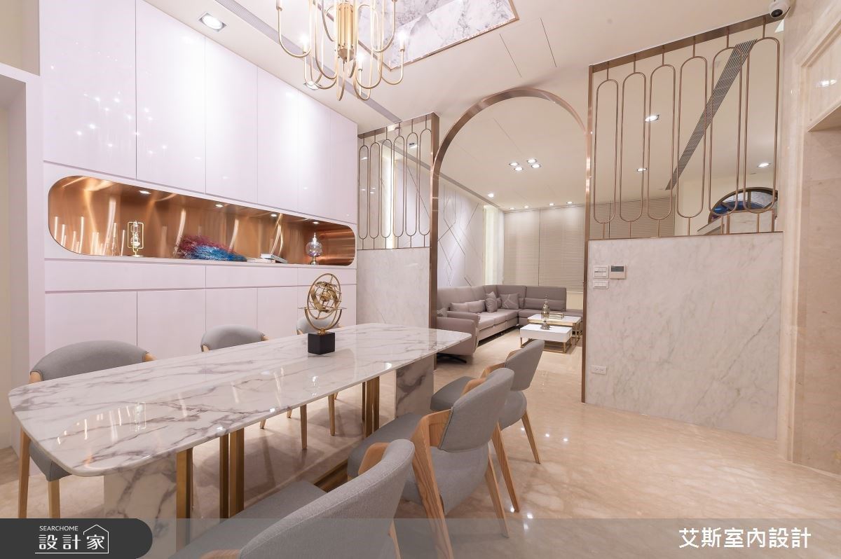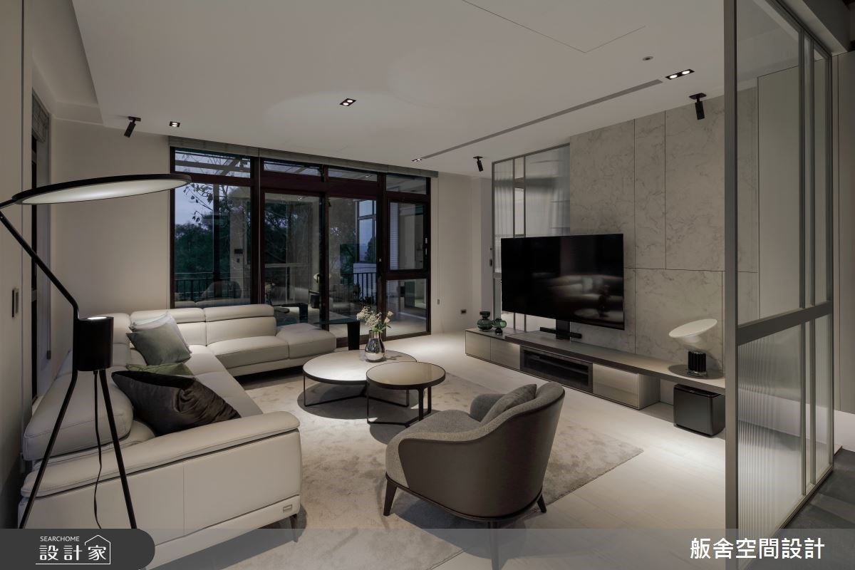 為滿足各種使用情境,通過獨棟建築的分層優勢,發展出各自的使用機能。玄關區域利用玻璃隔間輕量化空間佈局,選用水墨紋理清晰的大板磚製作出深淺層次,打上間接光源,成為進門處令人難忘的端景,而梯廳處則以通透玻璃、灰鏡延伸居家尺度,帶出流動的動感。公領域則跳脫電視牆的圈囿,發揮Lounge的精神,沙發區域結合長椅凳,以面朝窗戶的方式擺放,增進社交場域人際交流間的互動、達到引景入室的目的,也讓在此社交的人們視野更為開闊,吧檯區域緊鄰在側,實現豐富的宴客交流機能。