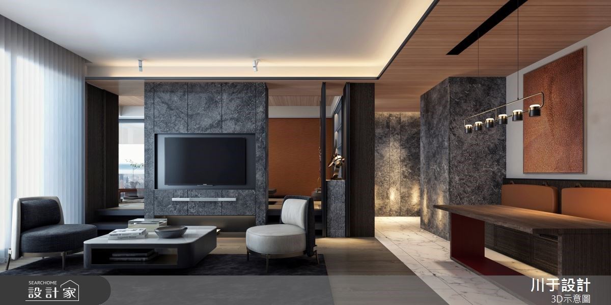 室內從地坪、壁面到天花板,皆運用了木質元素,天花板特別以木皮包覆,虛化大梁的存在感。圓弧橫渡天花板的設計手法,也讓空間從頭到腳充分展現木質的溫潤。不落地的電視牆設計,加寬了尺度,具備延展空間視覺的巧思;下方機櫃以茶玻襯托,堆疊視覺層次且倍感輕盈。客廳後方規劃了多功能書房,通透的玻璃材質,讓光影與視線得到了串連,同時呼應電視牆的輕盈感;書房內規劃了窗邊臥榻、擴增收納空間,補足公領域機能。餐廚設計隱形了廚房入口,巧妙換上鏡面,藉由鏡射特性擴增餐區視角,劃分領域的同時,保留完整且寬闊的領域感。