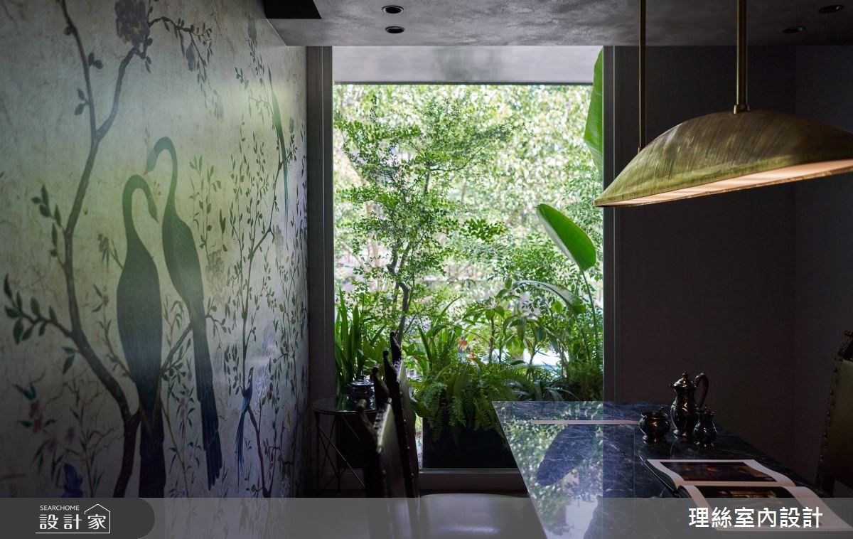 洗手間以門拱造型明確與用餐區的分野,牆上花瓣圖樣更隱喻著新中式風的柔美情懷。