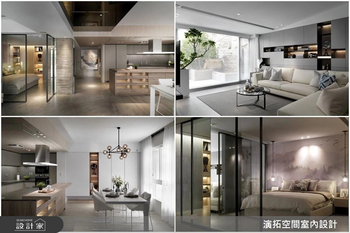 轉身來到餐廚場域,為了阻隔烹飪時的油煙味而加裝了折門,為了不破壞屋內整體的協調感,挑選大小不一的清玻璃作為素材也為空間增添設計感。來到主臥,延伸公領域的現代風簡約調性,以深、淺灰色系作為主調運用色彩的特性創造舒眠環境。在每一間的寢臥都配有一張單人閱讀桌,以貼合屋主喜愛閱讀的習慣。