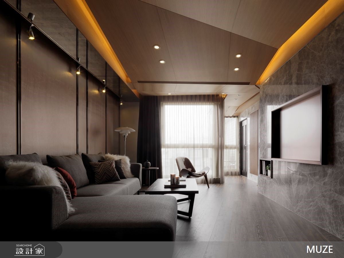 走入屋內,設計師在玄關處設以穿鞋椅並搭配高低錯落的櫃體,背牆處則以烤漆玻璃為輔可作為日常記事使用。順著動線來到客廳,映入眼簾的是仿大理石板電視牆,以石紋與溫潤的木地板相呼應,並運用鐵件、灰色玻璃及內嵌式LED光條營造出整體放鬆舒壓氛圍。