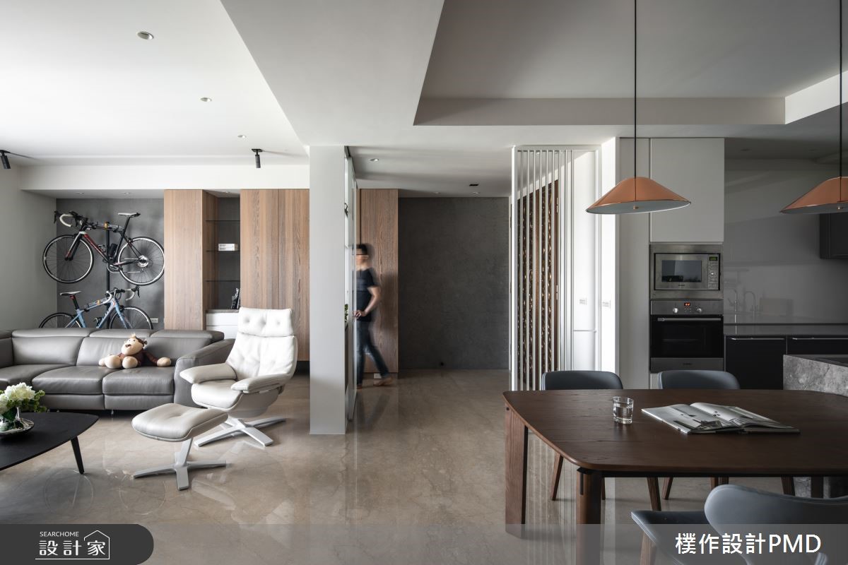 推開大門,以縷空立面為屏,巧妙界定出寬敞乾淨的玄關處,另一側牆面融入櫃體、鏡面材質,既保有收納機能,又放大整體視覺。平日家人互動交流的公共空間,採開放式手法,串起客廳、書房和餐廚區域,帶入充沛明亮的自然採光,打造連續不間斷的居家視野,讓大人們能隨時照看孩子們,更給予小孩一個盡情奔跑、玩耍的活動空間。隨著長沙發過渡至書房空間,可滿足大人工作、小孩讀書的需求,以及各種充滿趣味的生活體驗,背後的縷空收納櫃,則藉由幾何線條的遊走、明亮光影的投射,成就能展示藏品的端景設計。餐廚區域,以綿密細膩的木格柵線條,搭襯迷人花藝,形塑此處的視覺亮點,並悄悄將門片融入立面,維持清爽舒適的樣貌,同時,透過中島吧台和餐桌的連結,寫下流暢又便利的料理動線。