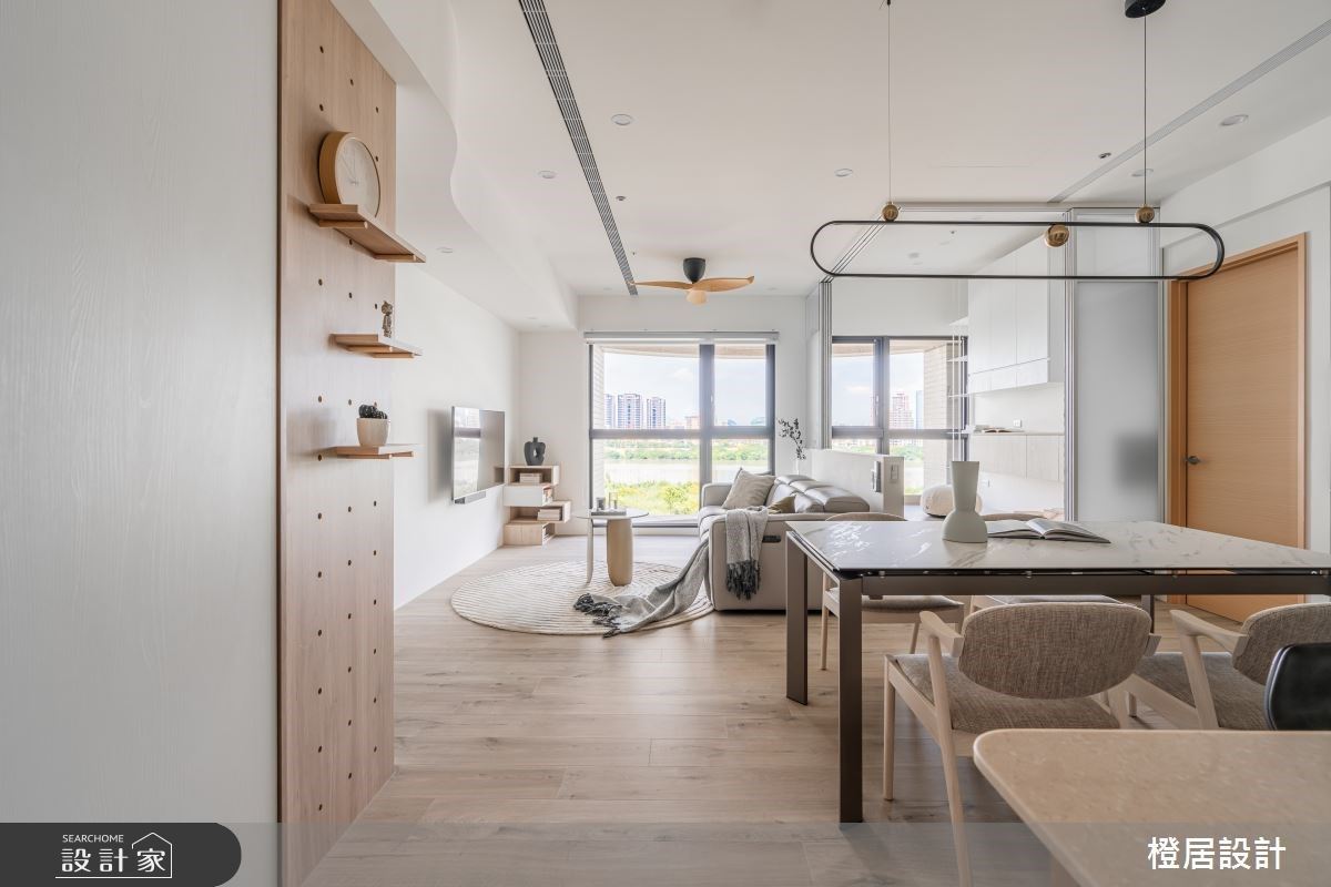 走入室中,玄關處鋪陳活潑的六角磚,運用不規則狀的空間界線,模糊落塵區的分野;架高和室地坪,增設升降桌,讓屋主兩人可於此處辦公、閱讀、品茶,同時明確愜意自在的休憩場域,立面的山巒造型呼應玄關地坪色彩,讓活潑鮮明的居宅個性成為入室後的第一印象,最後以彈性拉門,讓此處化身親友借宿時的臨時客房;公共區域鋪敘溫煦木質地坪,並規劃為開放式動線,敞開獲得最大的使用坪效,為屋主爭取更加舒適敞亮的行走動線,同時設置半高電視牆及中島,劃分不同性質的活動空間,更兼顧至開闊的視覺感受。