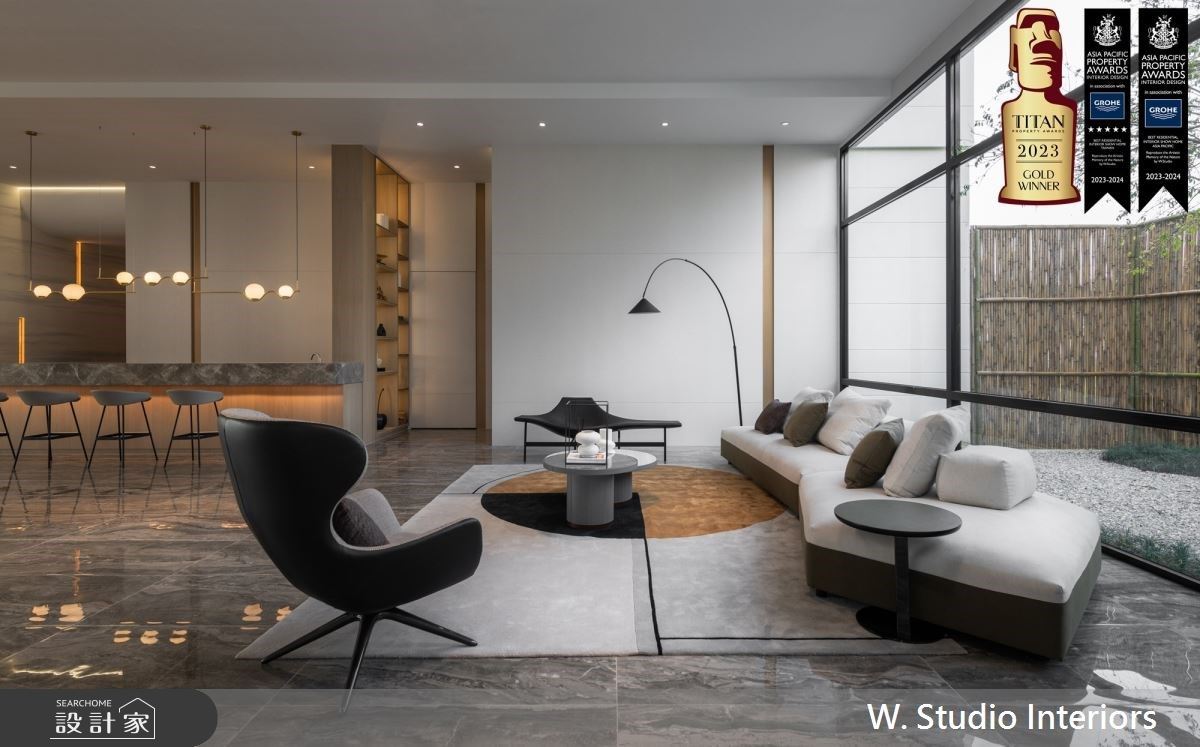 此案坪數108坪,為建商的接待中心,綵韻室內設計 吳金鳳、范志聖兩位設計師以溫煦木質調作為空間基底結合綠意造景,形塑敞亮舒適的場域氛圍,同時加入豐富的建材元素,打造現代風的多元面向,提供一處建商及業主安心討論洽談的空間,間接傳遞建商熱心為業主服務的本質。