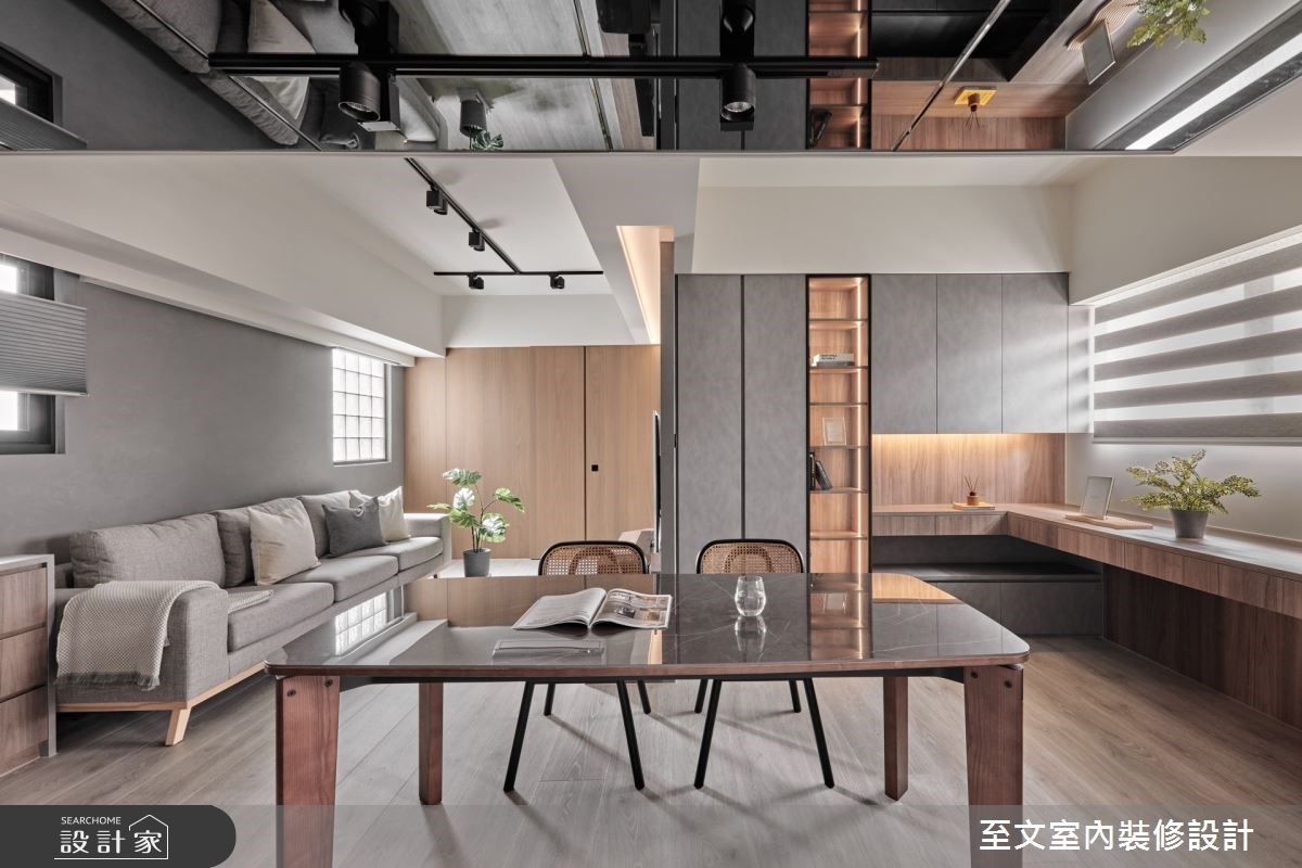 玄關使用清水模質感,營造寧靜氛圍,作為沉澱心情的過道,並規劃明確的落塵區,地坪延伸至收納櫃中段明確領域性,鞋櫃的展示平台配以暖色壁燈營造玄關端景。客廳使用淺色木紋、白色與灰色搭配,營造溫暖舒適的居家氛圍,收納櫃、電視櫃與臥榻選用同一材質,富有整體感,臥榻下方加入收納空間,簡潔的公領域也有強大機能。餐廳以臥榻取代椅子,使用餐環境變的更加放鬆。書房為獨立空間,以白色搭配淺色木紋,營造易於專心的氛圍,大量書櫃設計,滿足書籍收納需求。