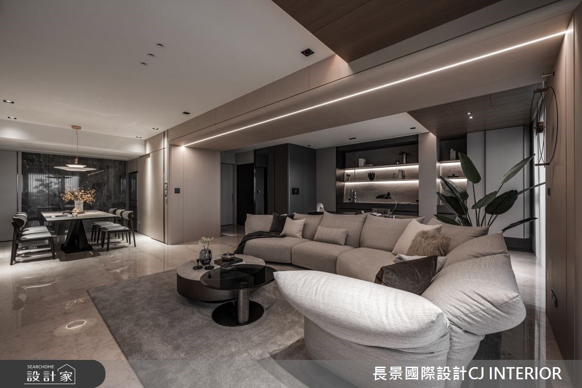 全室格局微調,使空間放大方正,純白電視牆下方的木質電視櫃,讓視覺更豐富,沙發背牆的山水畫壁紙,悠遠意境散發閒逸清幽的氣息,客廳與餐廳串聯,空間感更放大,神明桌整合收納櫃體立面拉平,創造視覺延伸感與一致性。